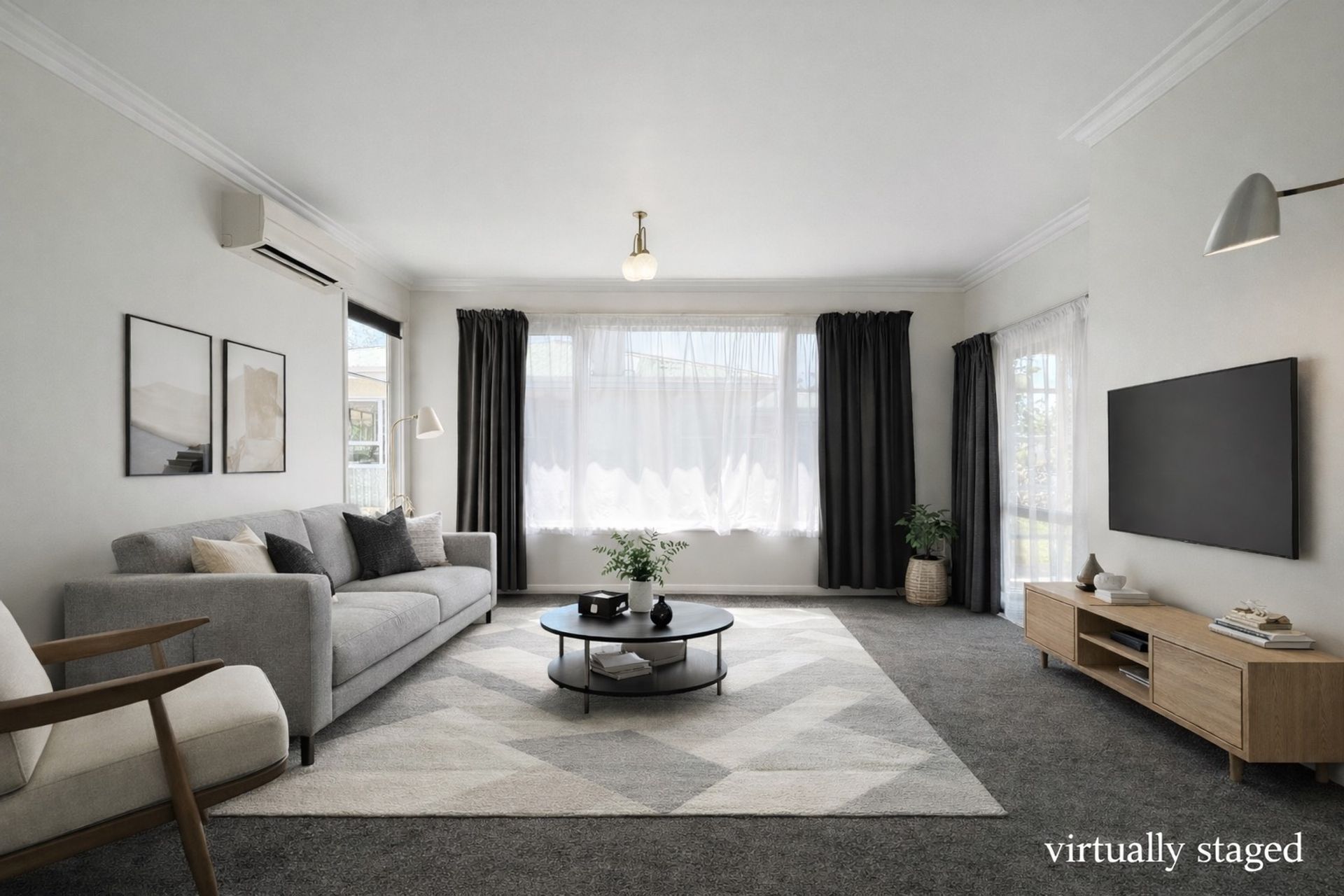 Step inside and you’re welcomed by a sunny lounge that feels immediately relaxed and inviting. Large windows draw in natural light, soft sheers frame the outlook and a heat pump keeps the space comfortable year-round. The layout flows easily through to the dining area and kitchen, creating a functional hub for everyday living.