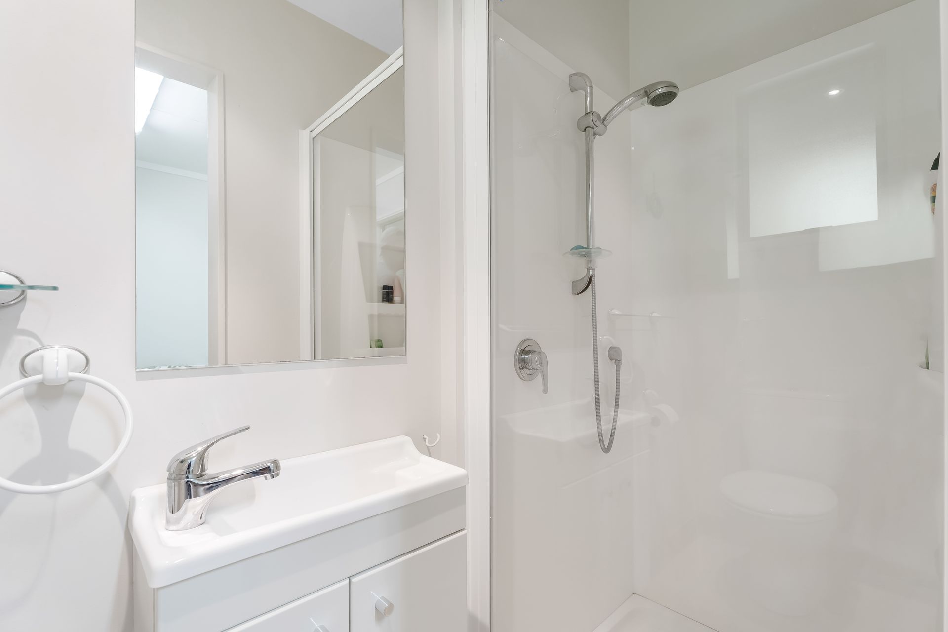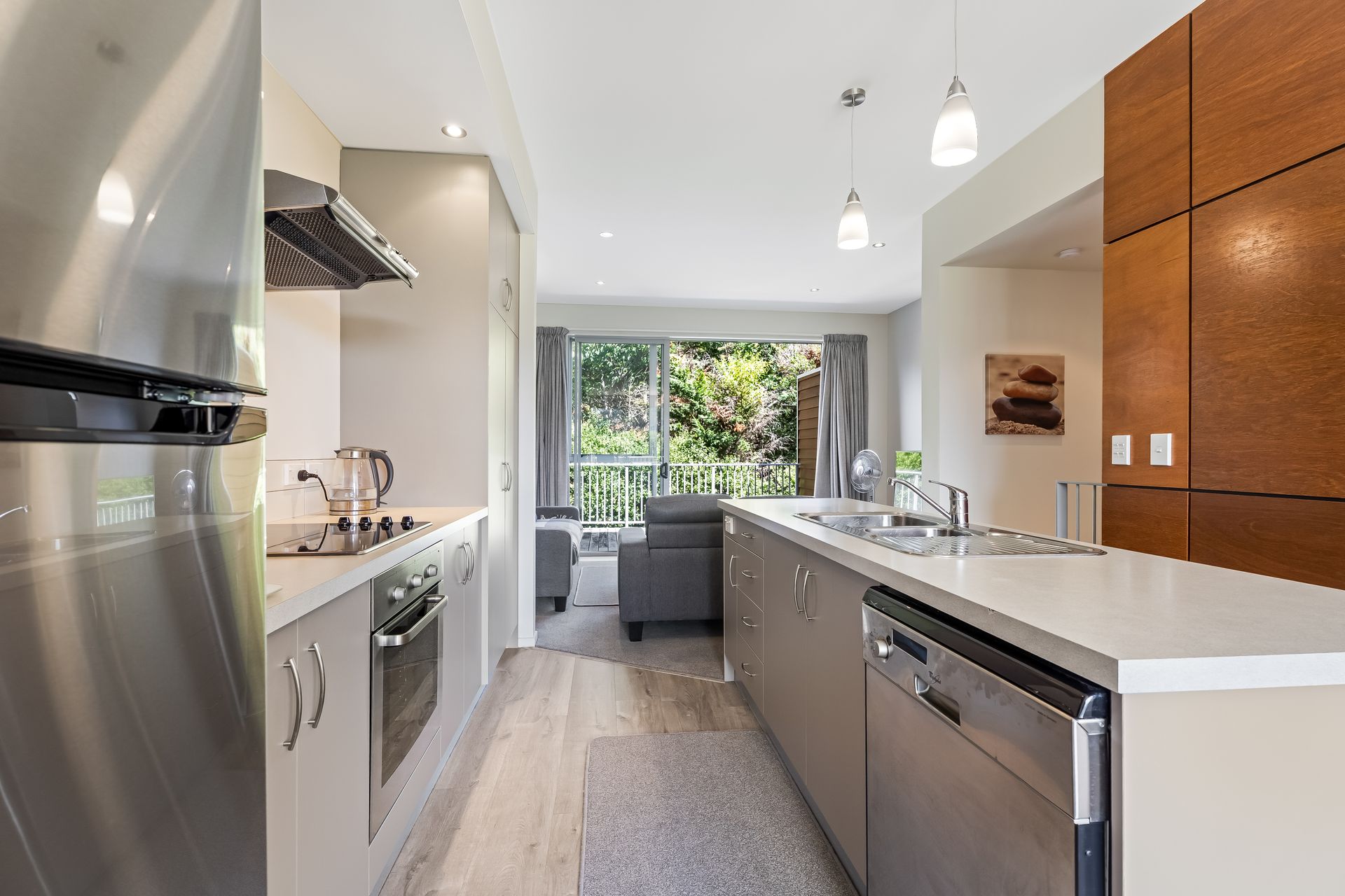 Upstairs, the main living zone opens via glass sliders to a private balcony, an elevated setting where morning coffee comes with salt in the air and evenings stretch into dusk. The kitchen is well-appointed with modern fittings and appliances, great for everyday meals as well as intimate gatherings. There’s room here to unwind, host friends, or simply let the coastal pace set in.