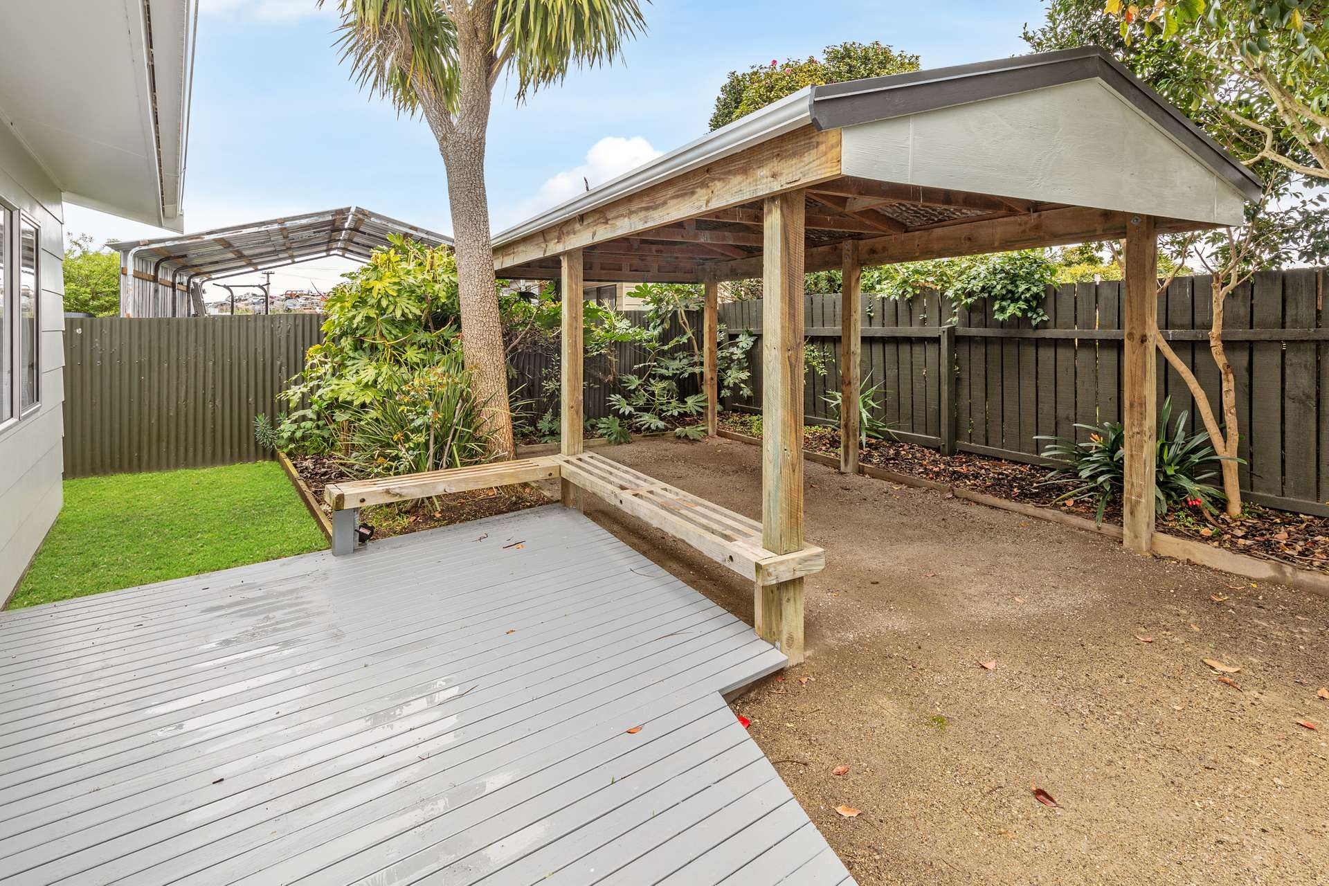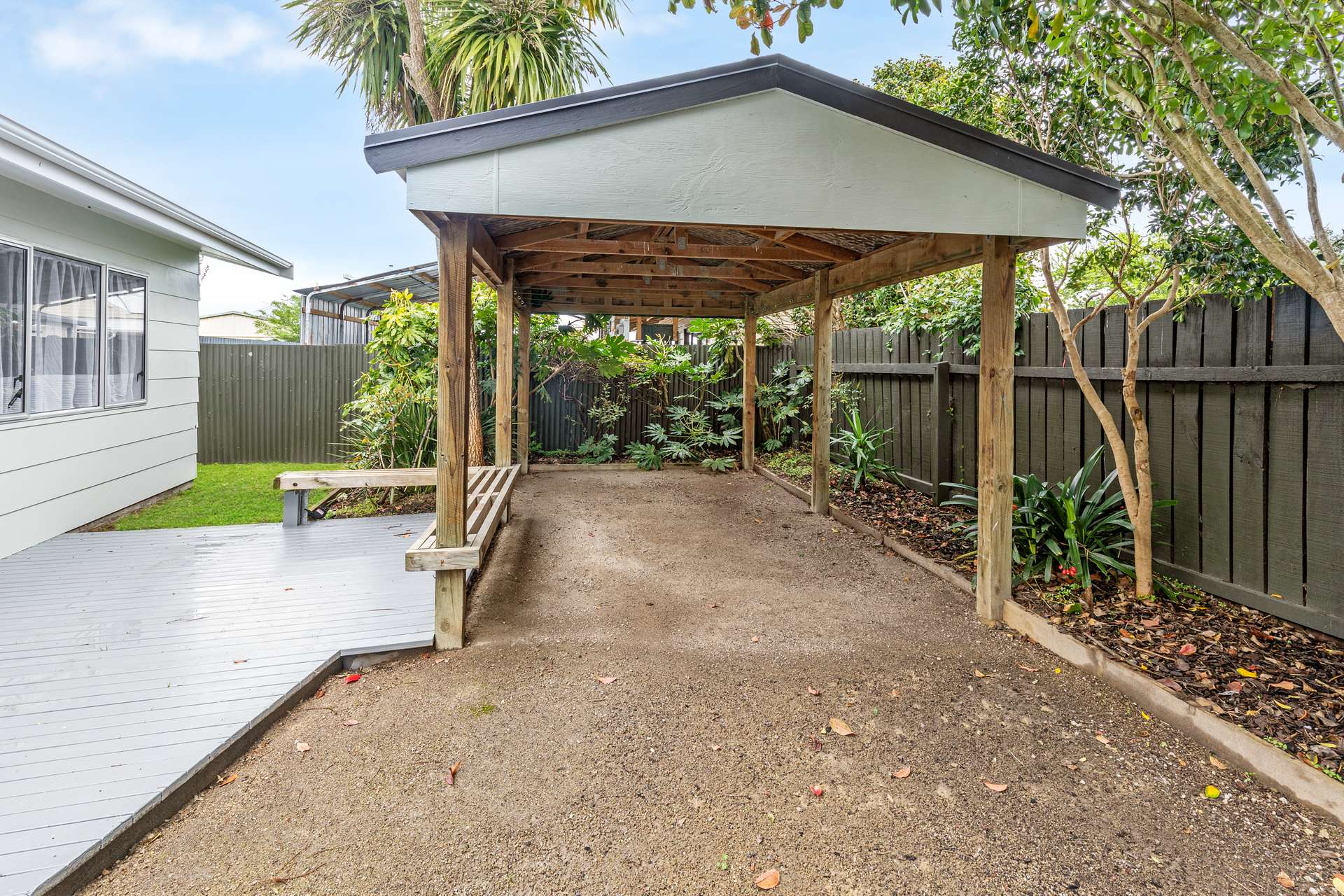 It has a carport and extra off-street parking for guests.
