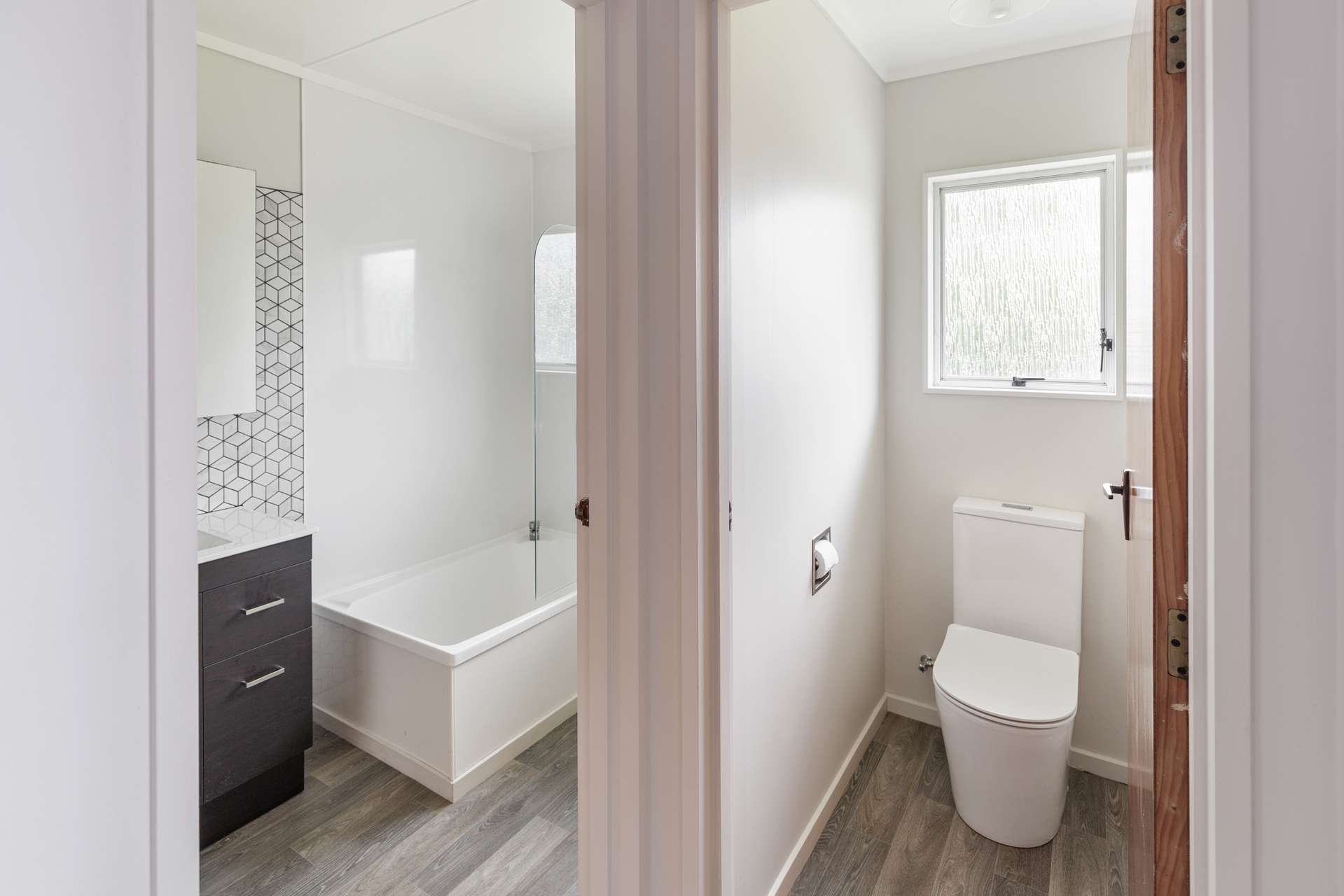 The new owners will love the bathroom too which features geometric tiling around the vanity. The bathroom has a corner shower with shub for the kids, vanity and a separate toilet next door.