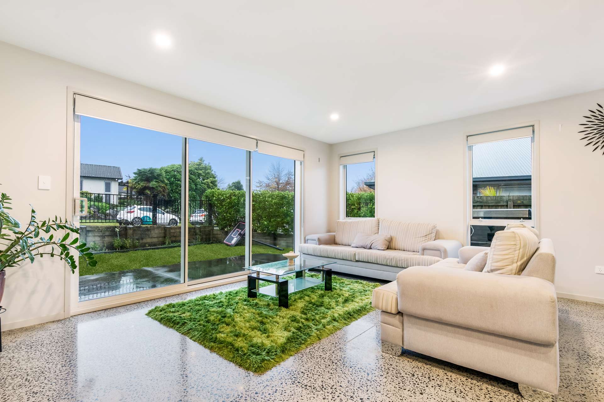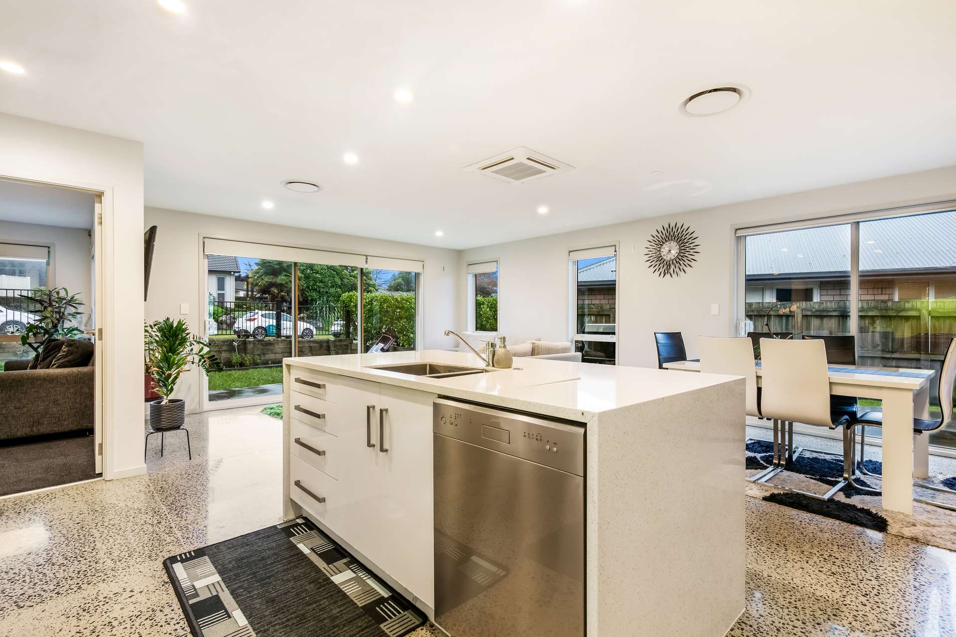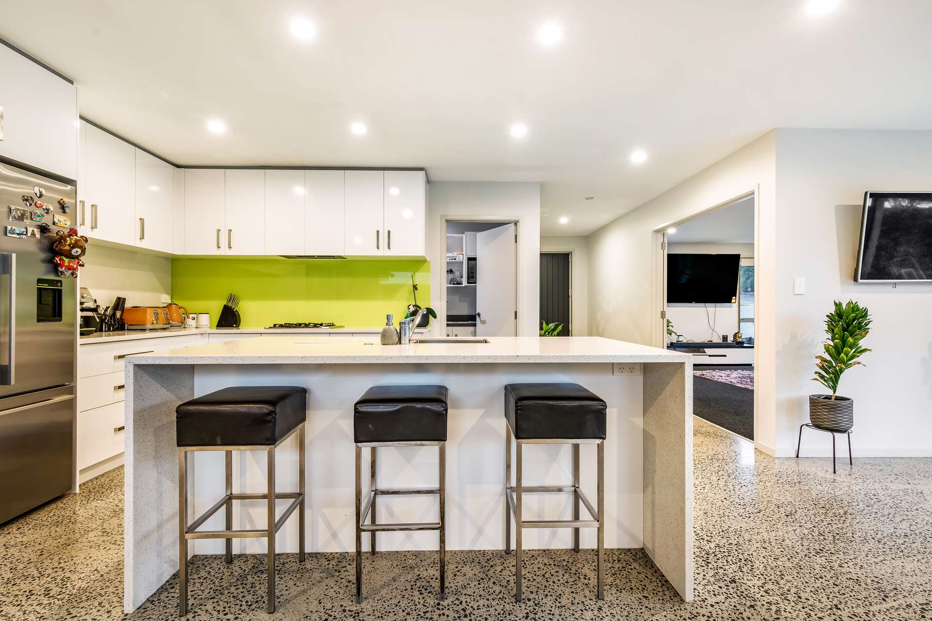 Inside, you’ll find a spacious open-plan kitchen, living, and dining area, complemented by polished concrete floors for a modern touch. The generous layout includes large windows that let in natural light and create a nice connection to the outdoors. There’s also a separate carpeted family room, offering that all-important second living space.