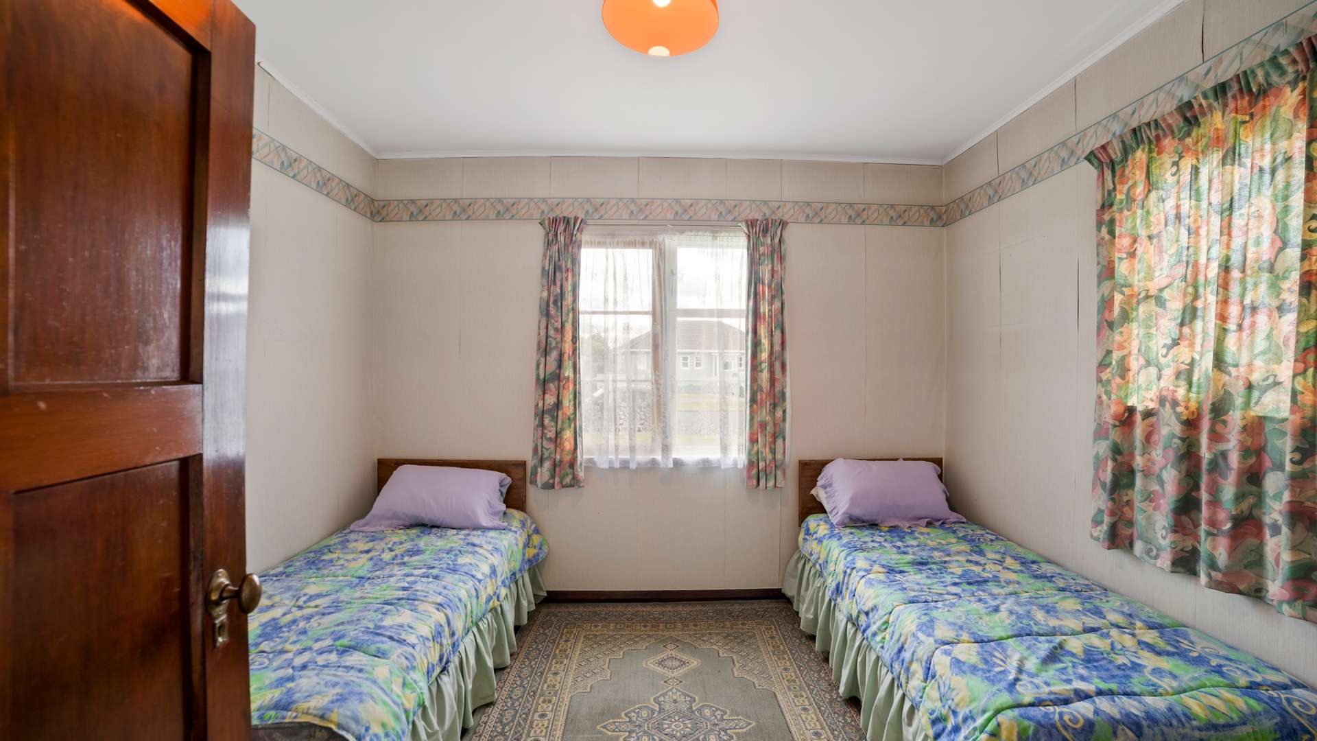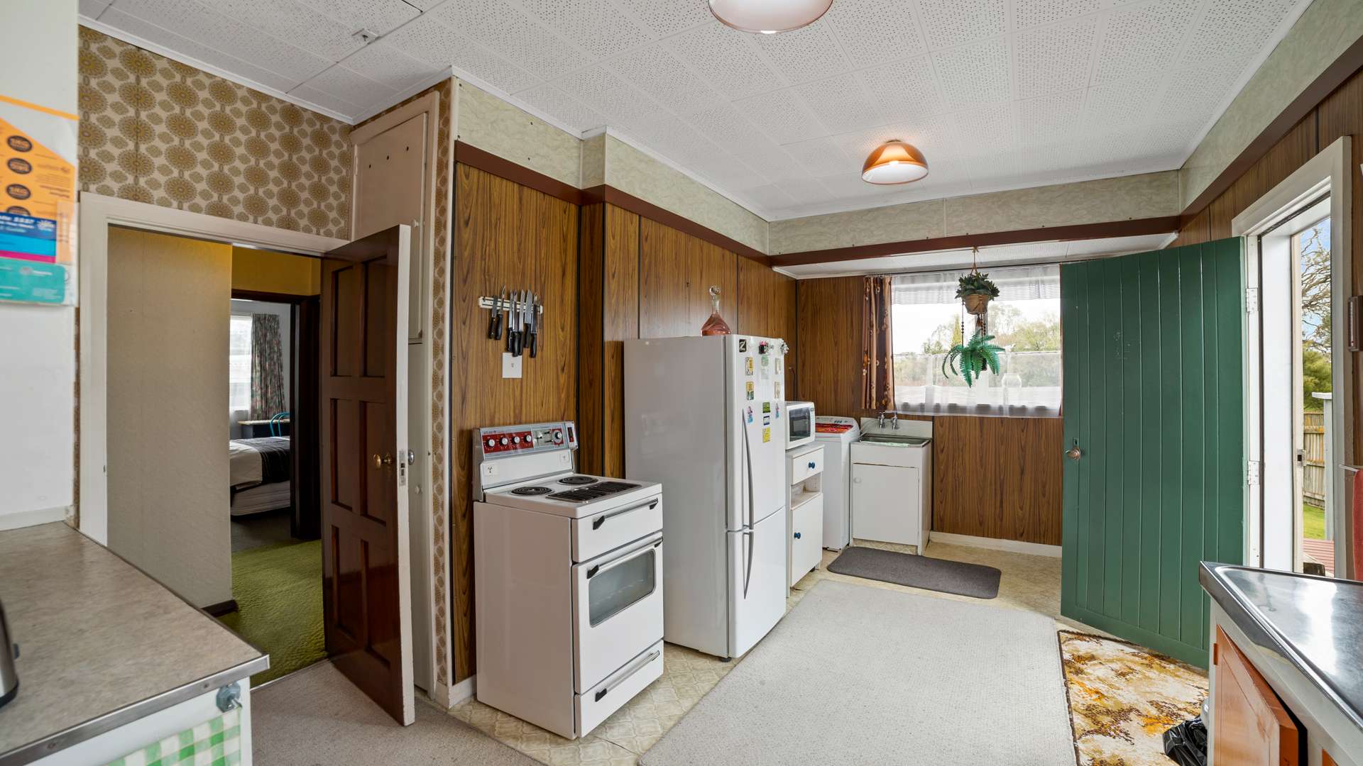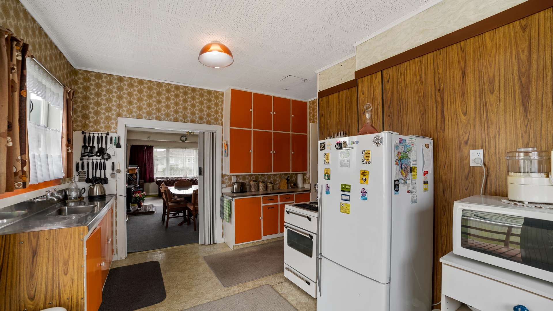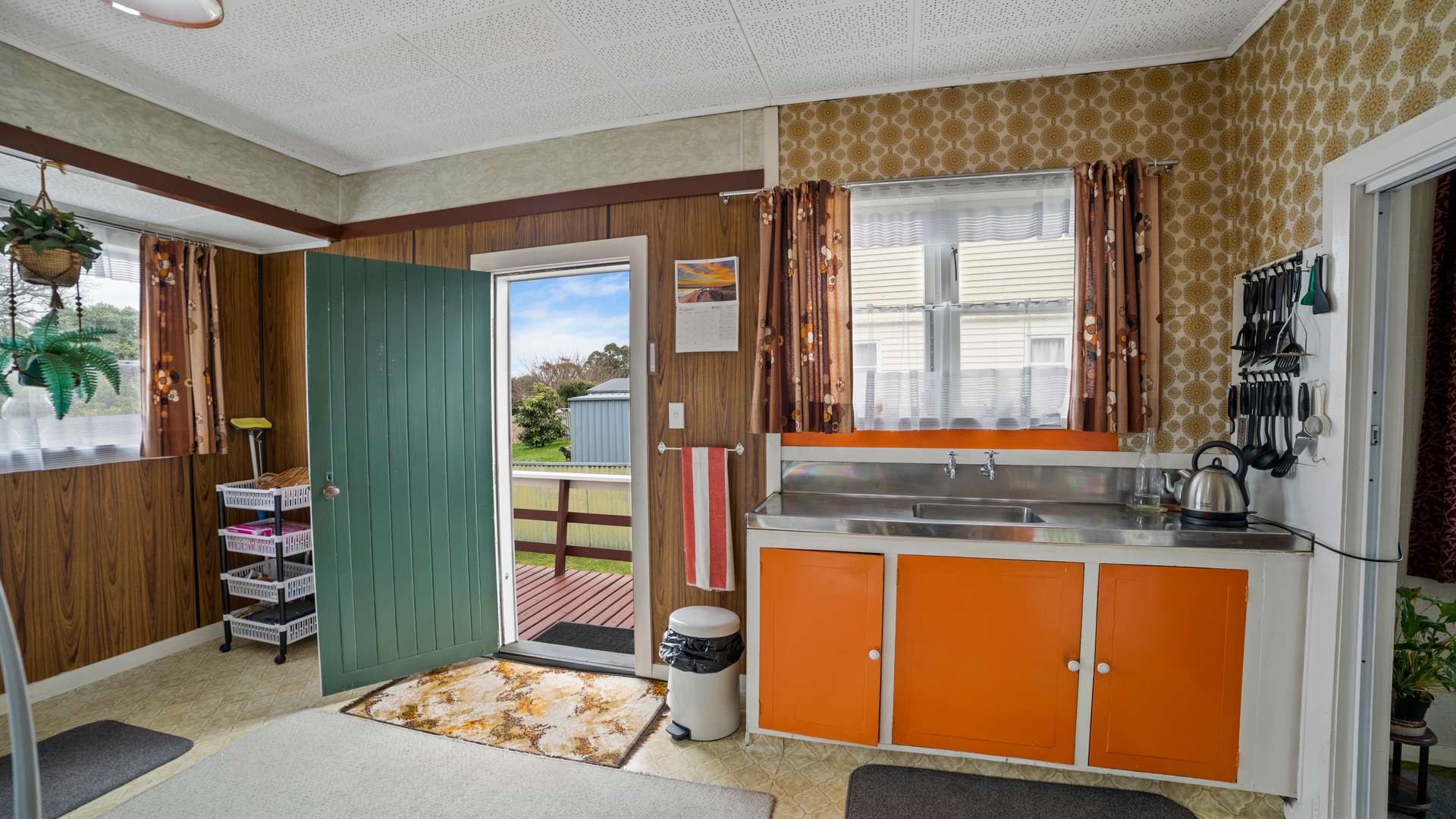Large kitchen/laundry space, with bold orange cupboards. Keep as is or modernise to your hearts content! Enter through a concertina door to your