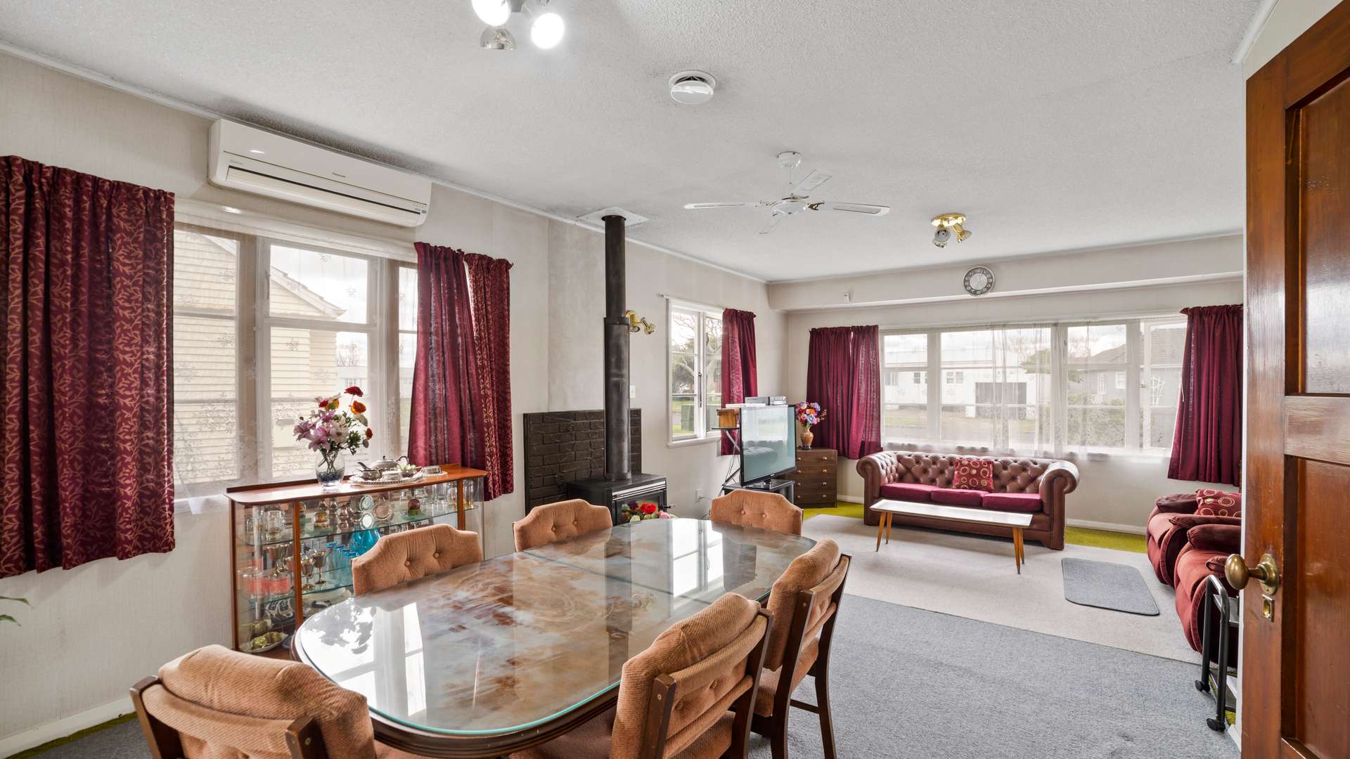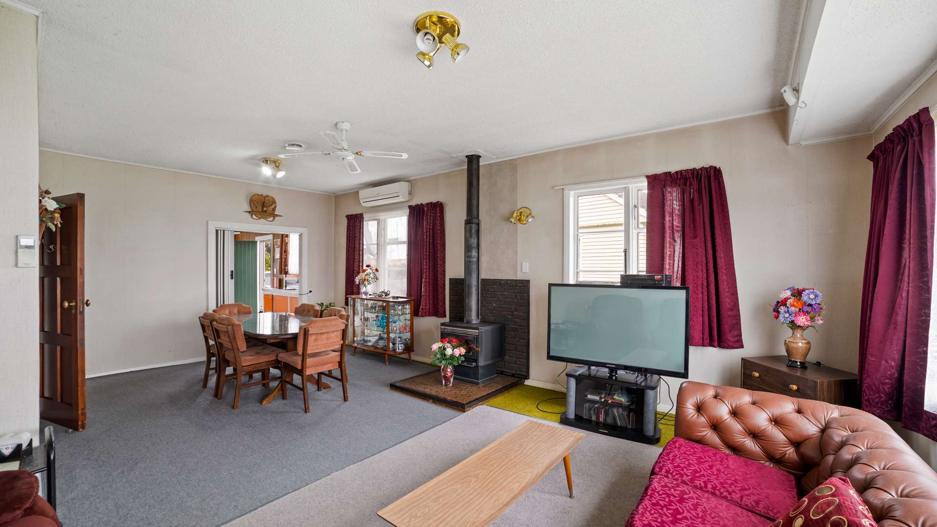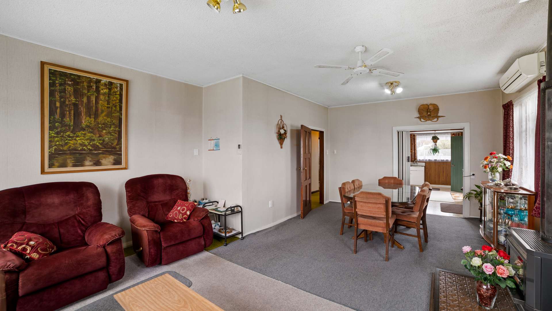 warm and welcoming, open plan, living/dining area. With a fireplace to keep you warm and cosy over winter, and a ceiling fan for the height of summer, as well as a heat pump/air conditioner.