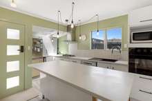 Leading off the living room, the stylish kitchen and dining area also flows seamlessly outside, so you can easily enjoy summer BBQ’s or dine alfresco with family and friends. The kitchen features crisp white cabinetry, modern appliances, and a sleek white island bench that provides storage and extra casual seating.