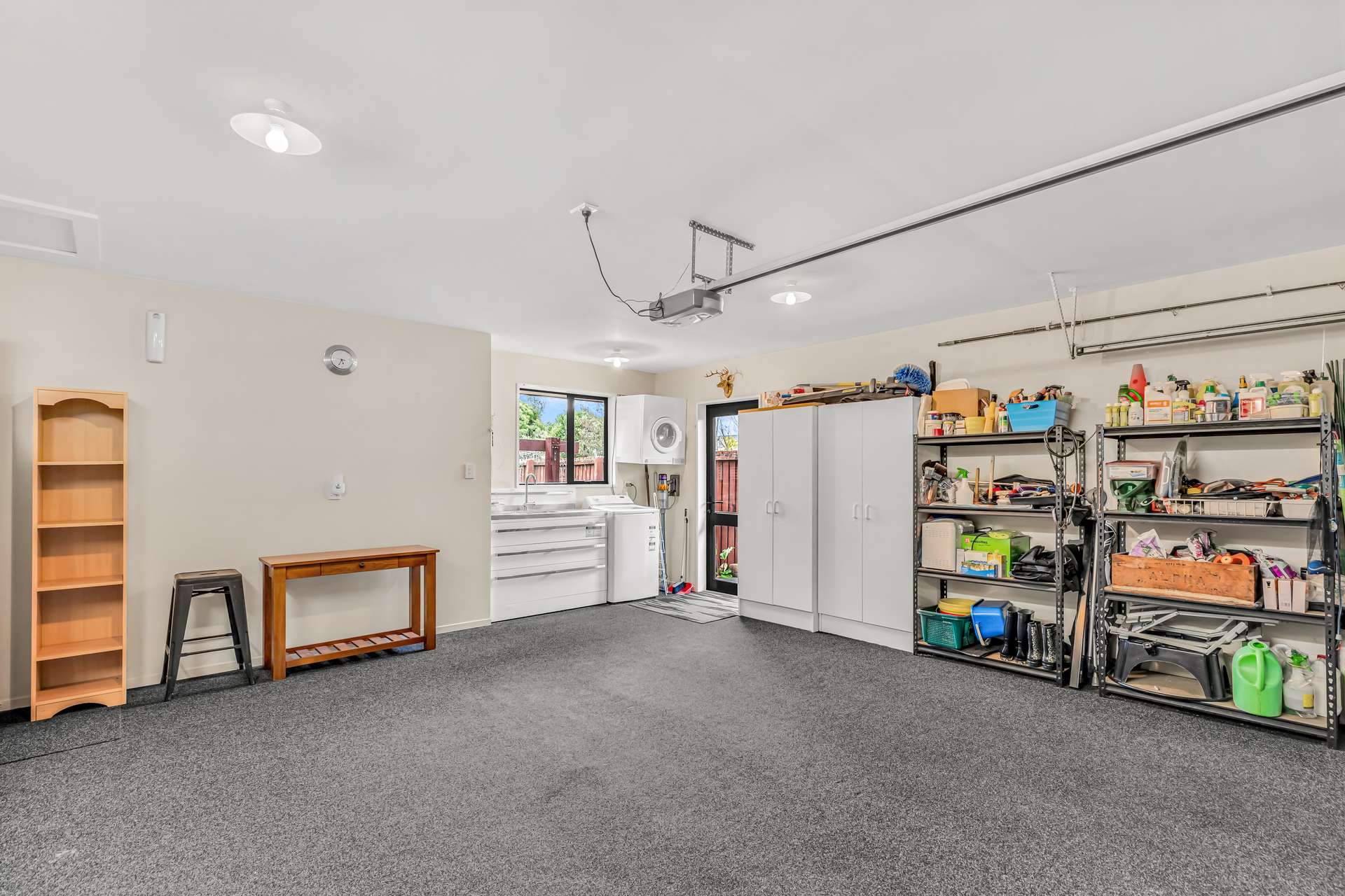 The laundry is set within the carpeted double garage, which also has plenty of extra space for a workbench and storage/shelving.