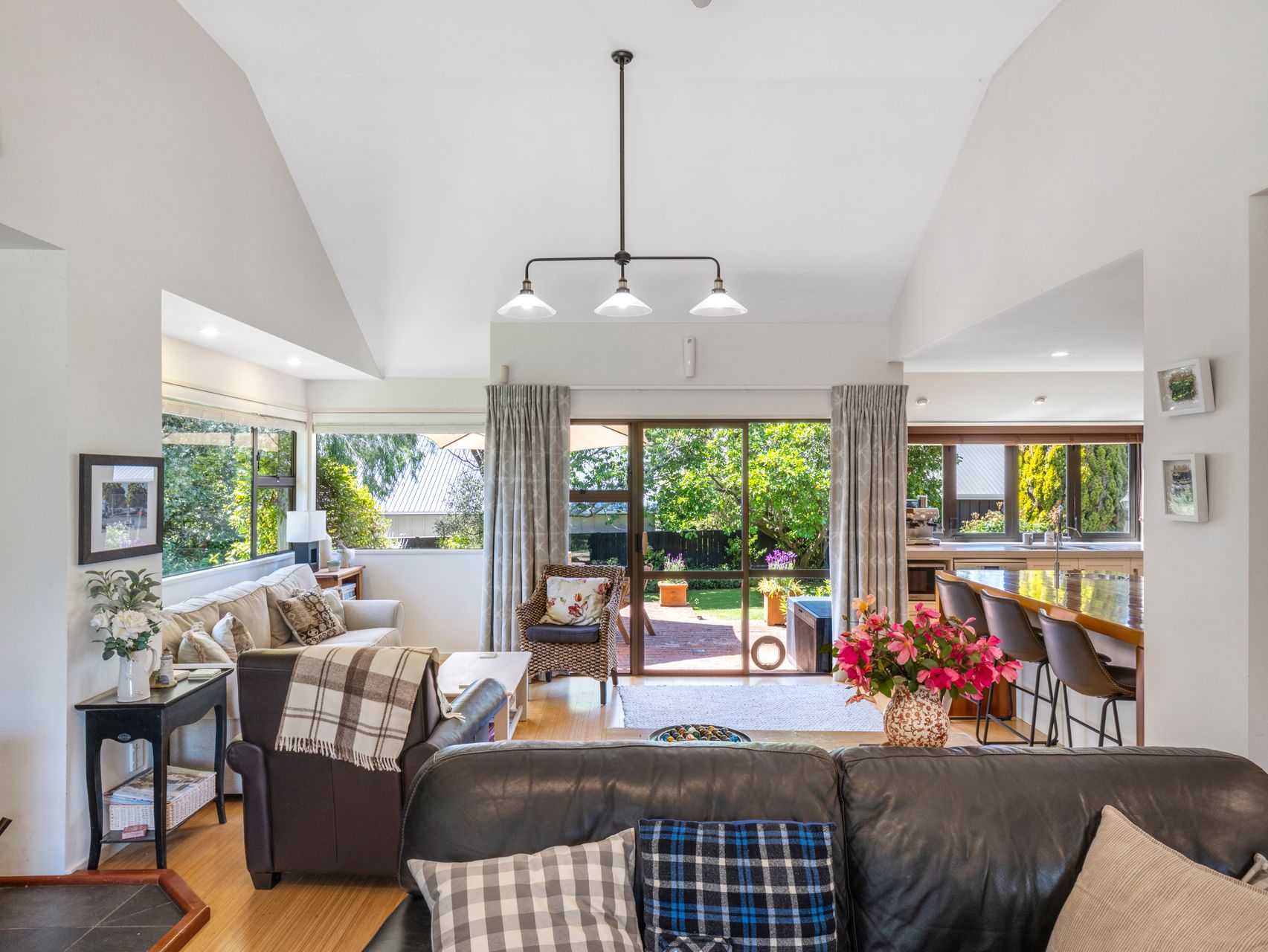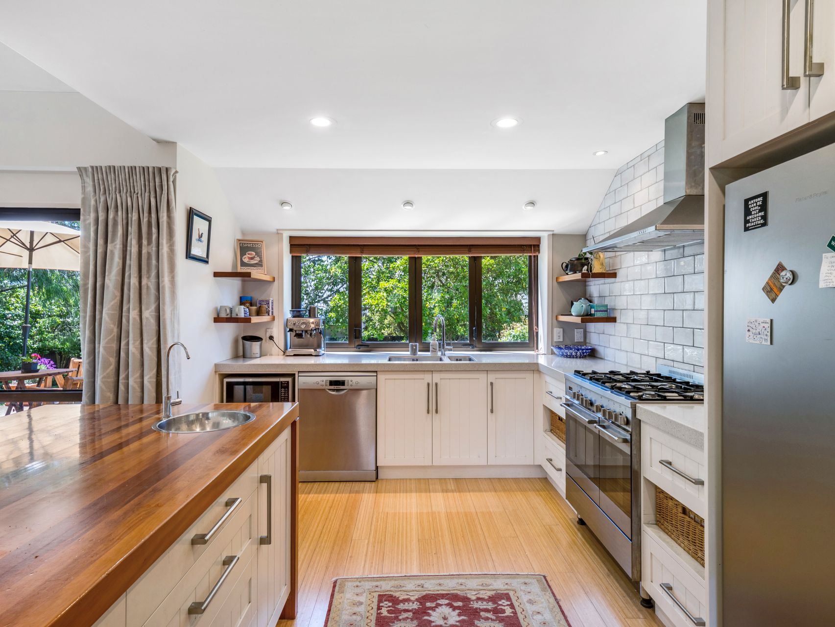 Inside, light pours into the open-plan living, dining and kitchen spaces. High ceilings and garden views create a calm, easy rhythm, while sliders open straight to the patio for effortless entertaining. The kitchen blends beauty and function with a solid timber island, subway-tiled splashback, and serious storage. It’s where conversation starts and everyone gathers.