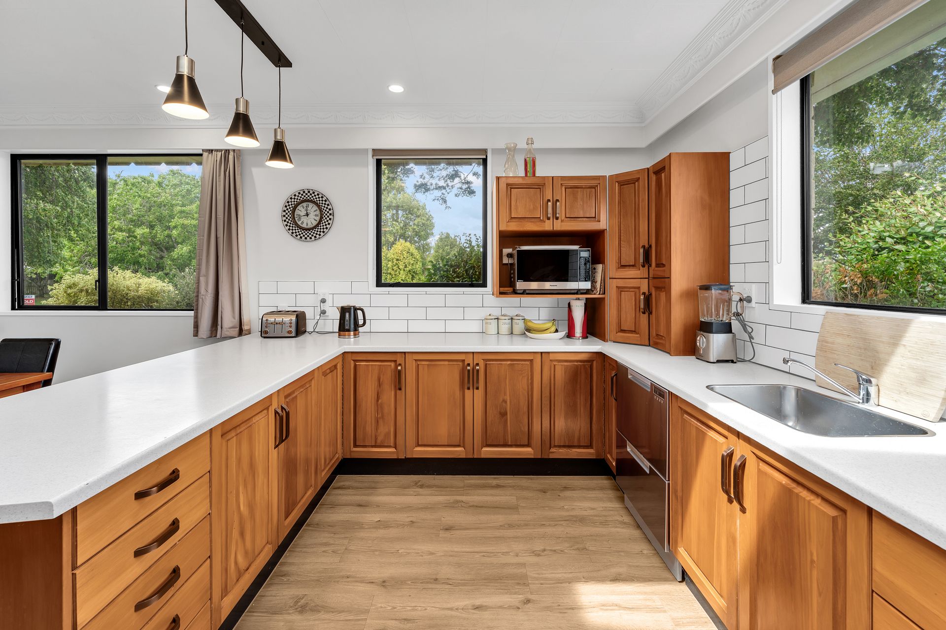 The kitchen is one to be envied, offering timeless timber cabinetry, a breakfast bar and ample space for the home chef. A skylight enhances the sense of space, while the large dining area easily accommodates meals and gatherings. With direct access to the internal double garage and laundry, as well as a separate entry hall, everyday living is seamless and convenient.
