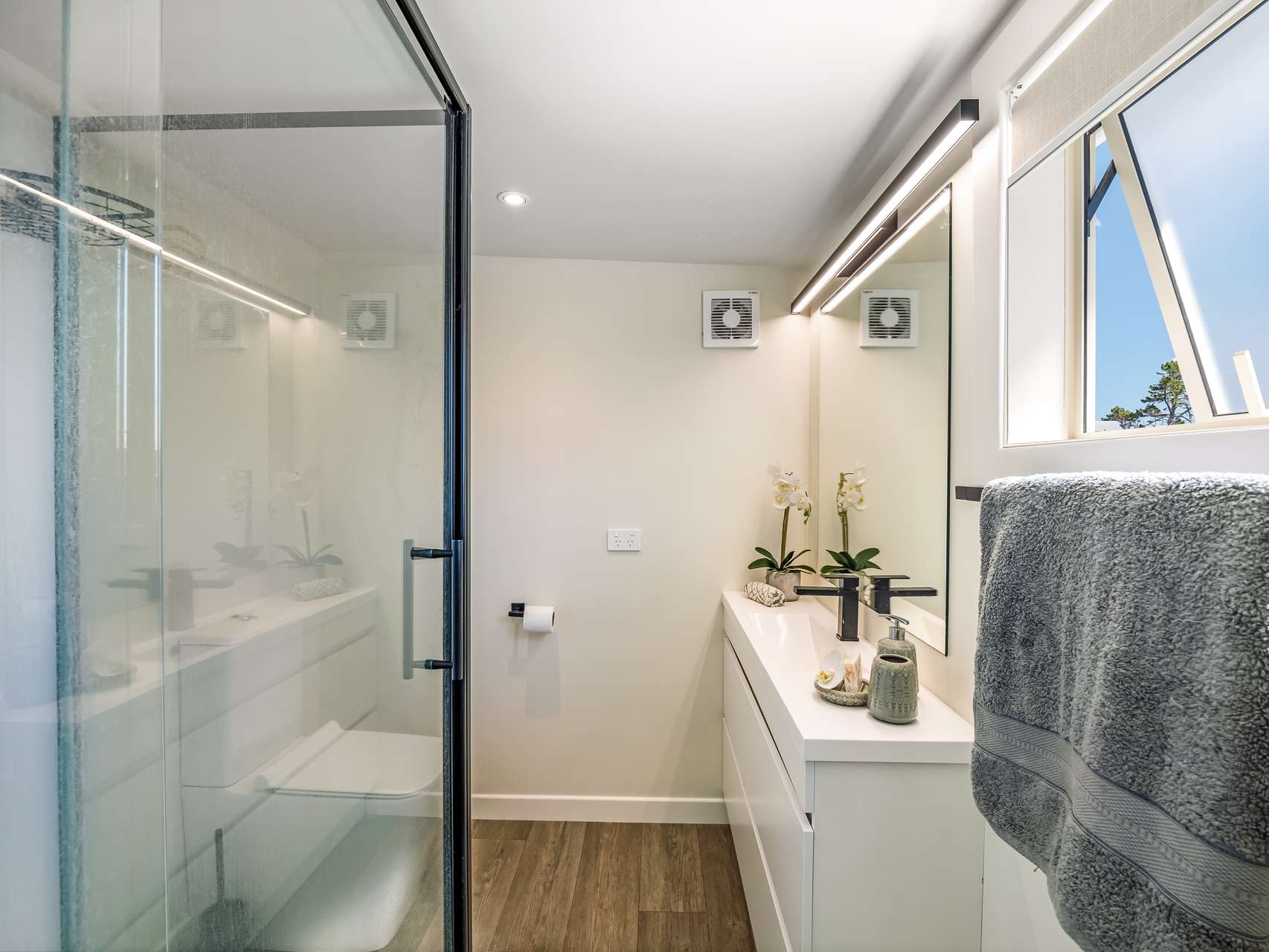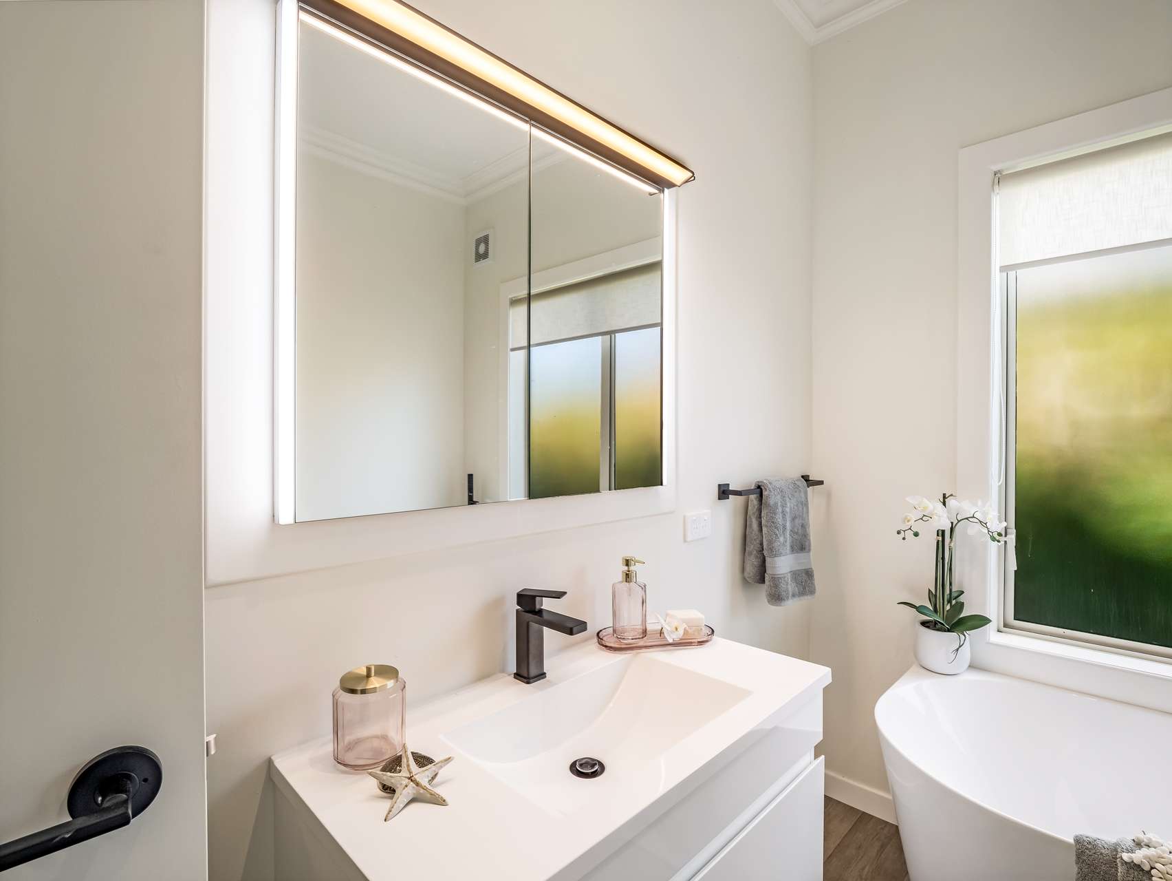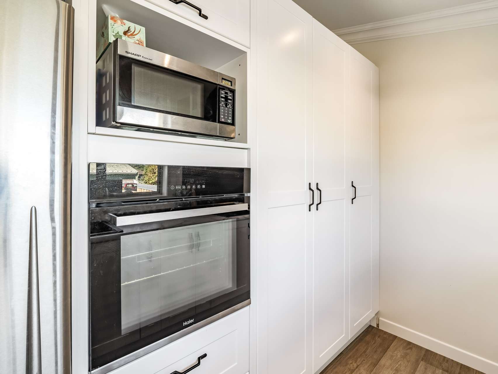 The kitchen is a showstopper – with a sunny green outlook, crisp white shaker cabinetry, stunning marble benchtops, quality appliances, and black hardware that adds a touch of sophistication.
