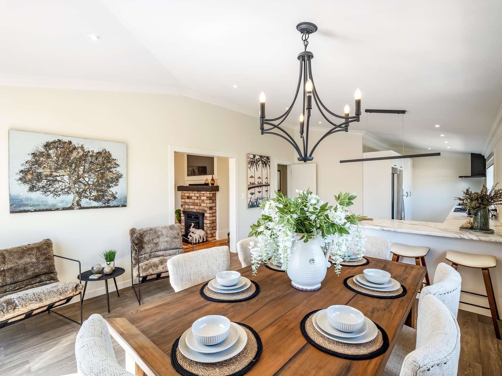 Inside, you’ll find enchanting details – from the elegant chandelier in the lounge to the ceiling rose, panelled ceilings, and gorgeous flooring. The main living area is a beautiful space to relax and unwind, warmed by a fireplace and filled with light. It connects beautifully with the open plan kitchen and dining areas creating a natural hub for everyday living and entertaining.