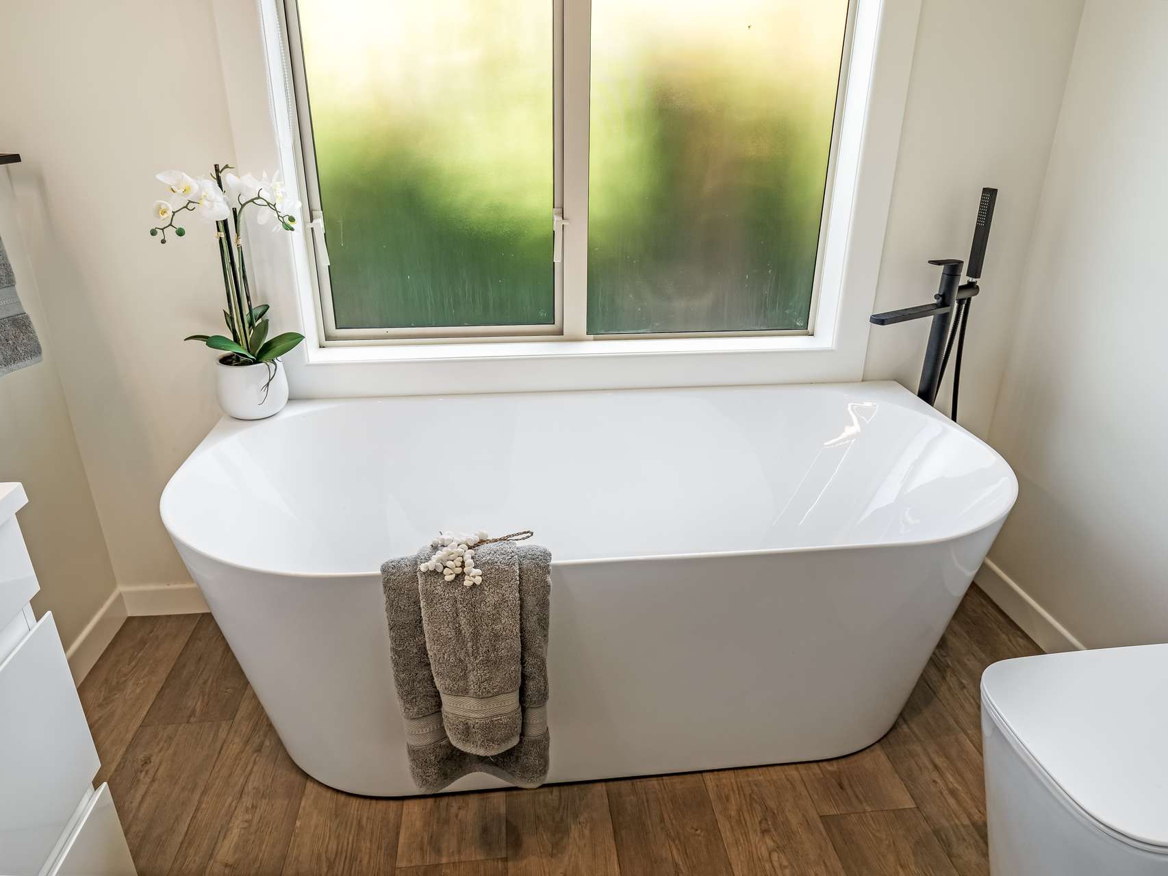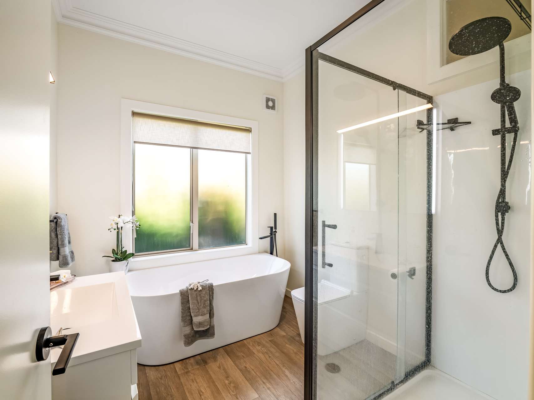 Perfect for families, the home offers four well-appointed bedrooms. The spacious upstairs suite is a standout, complete with ensuite and extra storage. Downstairs, three more generous bedrooms with soft carpet and neutral tones provide comfort and style for children, guests, or a home office setup. The family bathroom boasts a freestanding bathtub and separate luxurious shower, plus there’s a second guest toilet and a stylish laundry with thoughtful style choices.