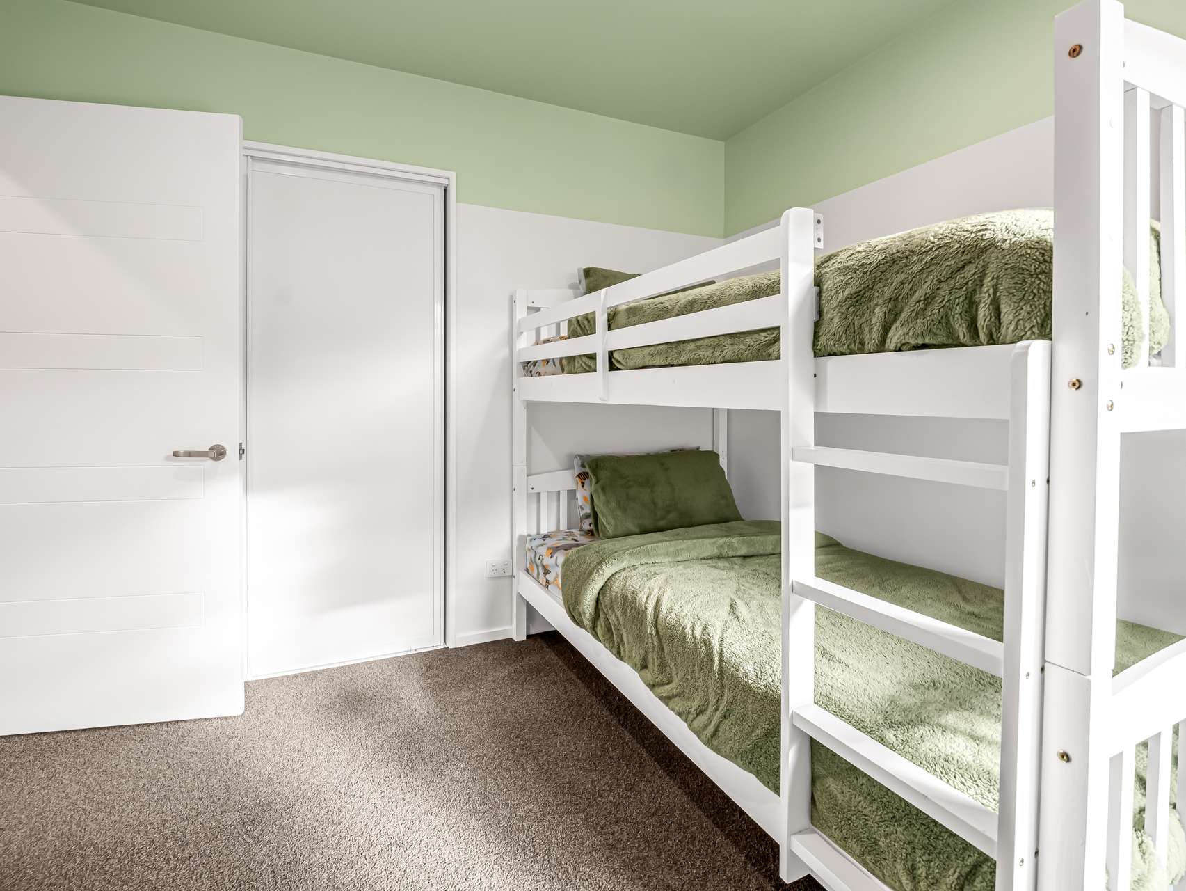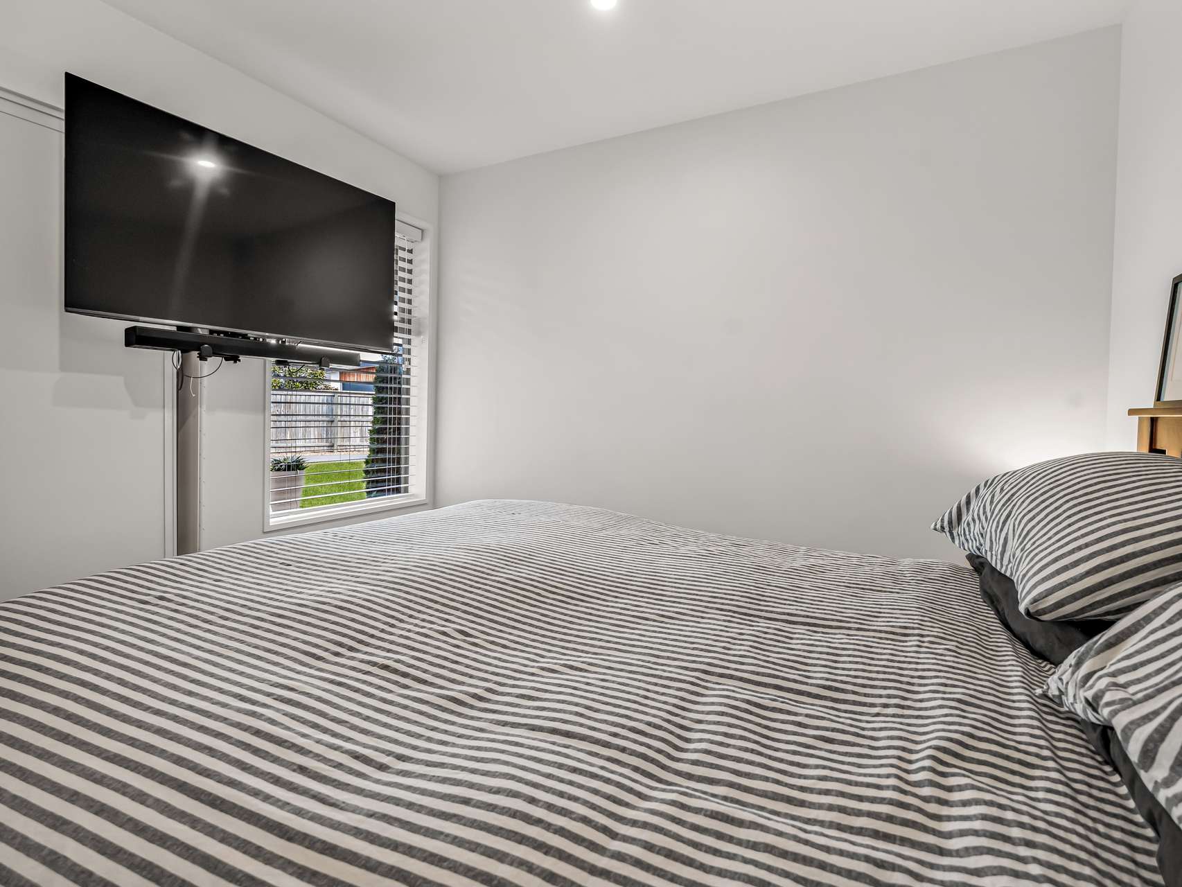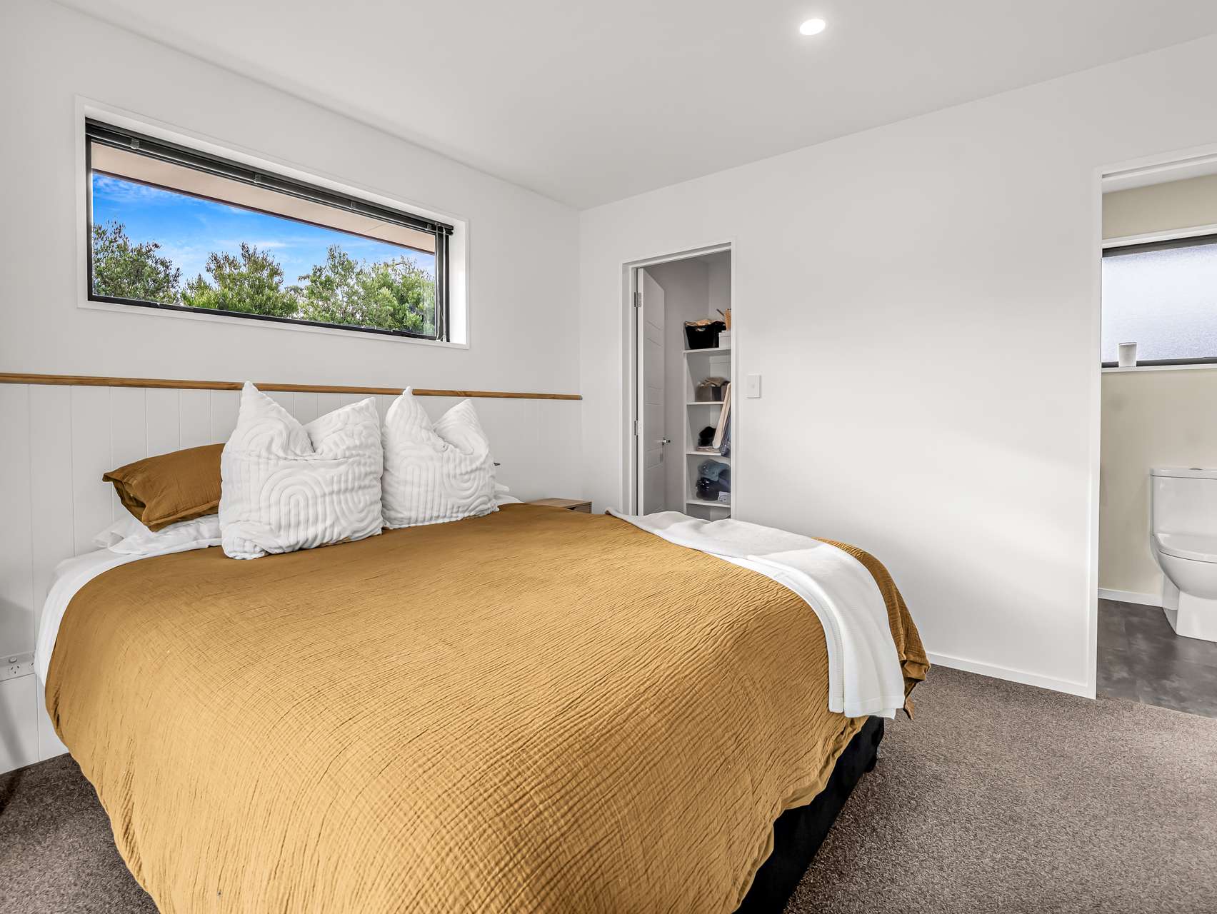 The master suite includes a tiled ensuite, walk-in wardrobe, and slider access to the patio, creating a private retreat. Three further bedrooms are serviced by the family bathroom with separate bath, shower, and toilet with handbasin. A neutral aesthetic and a sun-smart design ensure light and warmth throughout.