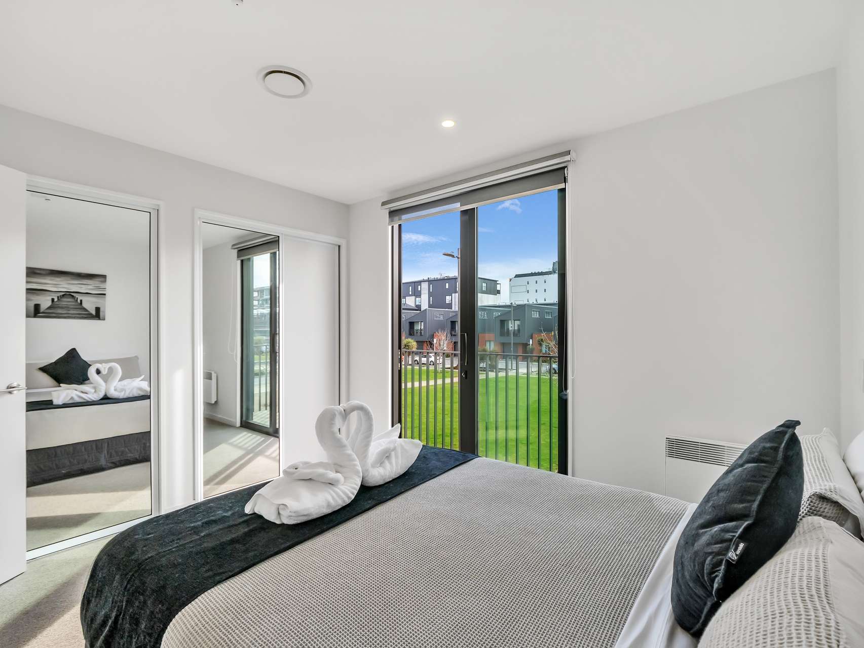 The open-plan kitchen, dining, and living areas are sleek and smart, with all the best in modern comfort and practical design. Caesarstone benchtops, light-coloured flooring and crisp white walls deliver a fresh, airy feel with plenty of natural light. Open up the large bi-fold doors to enjoy your superbly sunny courtyard, perfect for relaxing or entertaining with views across Rauora Park’s green open space that won’t ever be built out.