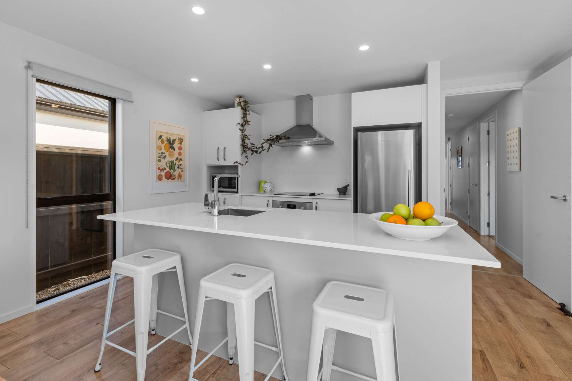 Awash with sunlight, the open-plan living area, anchored by a kitchen with engineered stone countertops and Bosch appliances, opens wide through a stacker door to the patio, effortlessly merging interior comfort with outdoor enjoyment.