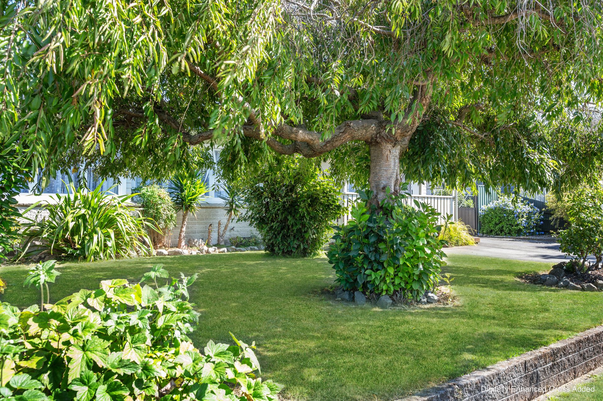 A wide driveway leads to the garage and covered entry, while the manicured front lawn, established plantings and a striking feature tree create a welcoming first impression from the street.