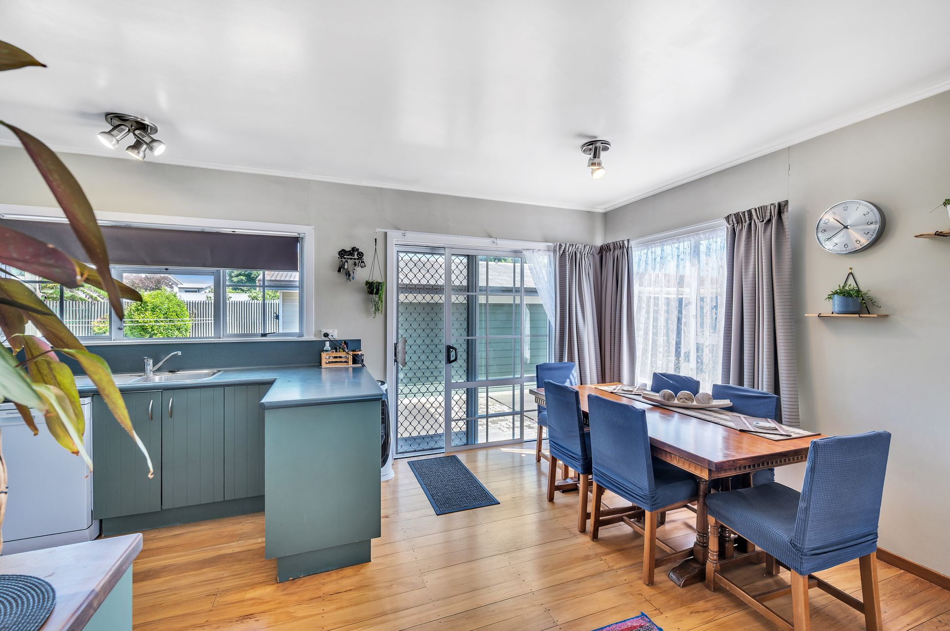 The kitchen is functional and thoughtfully arranged, with ample bench space and a sunny outlook. It connects seamlessly to the dining area, where soft sheer curtains filter the light and sliding doors invite you outside - perfect for everyday living and casual entertaining.