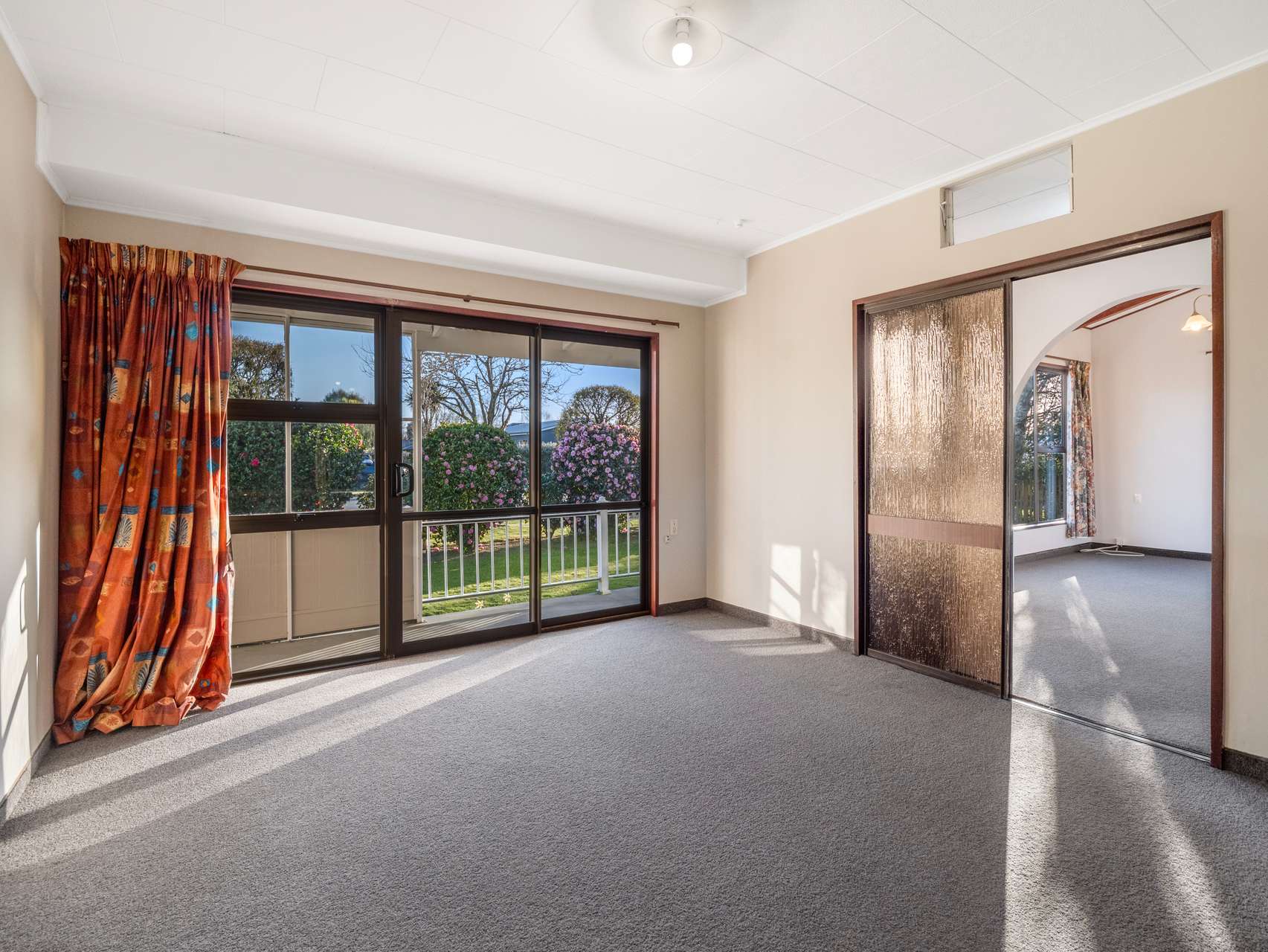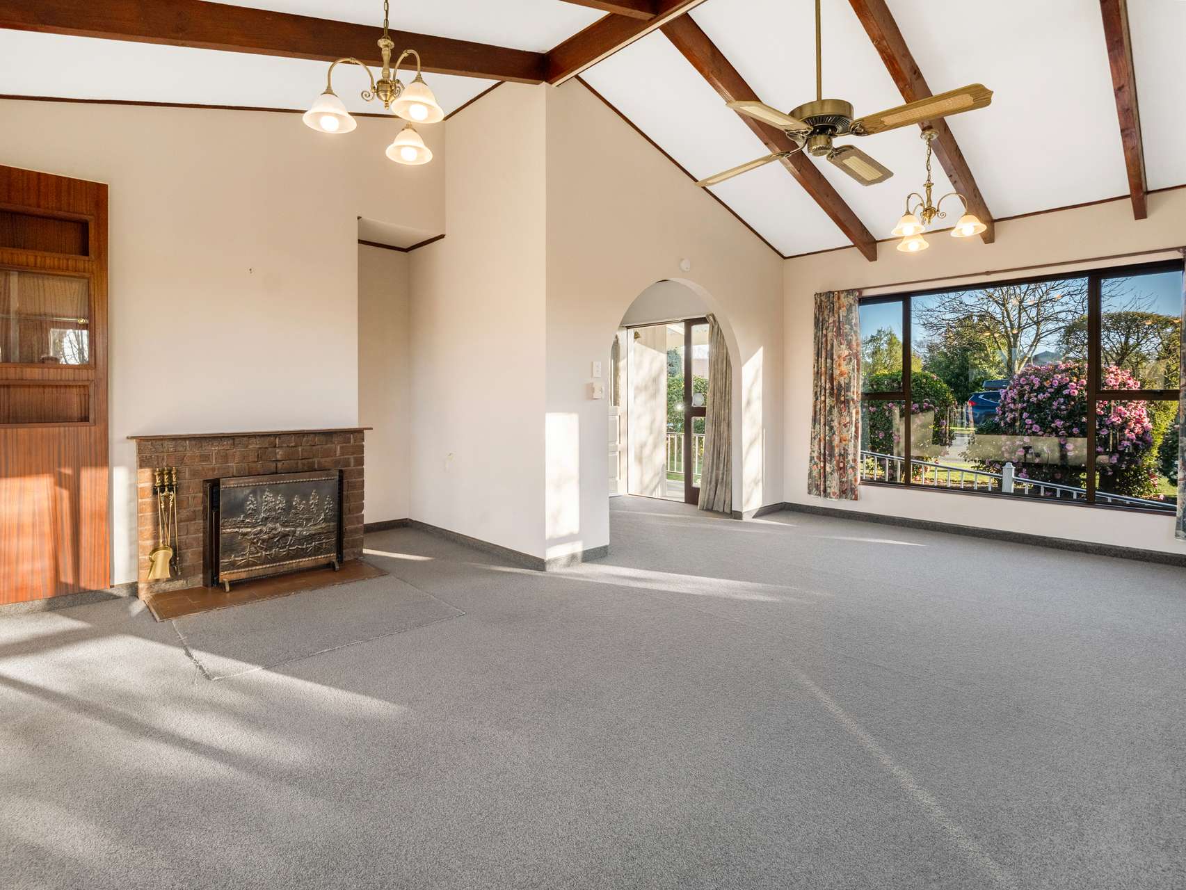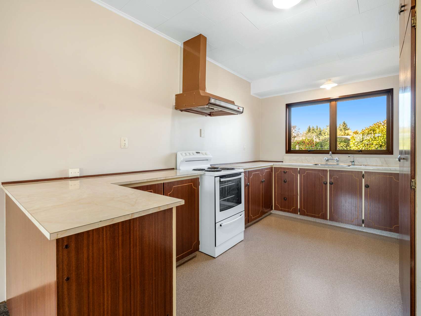 Inside, light fills a large, high-stud lounge with exposed beams and a log burner for winter comfort, supported by a new heat pump. The adjoining kitchen-dining zone is practical and well-proportioned - perfectly serviceable today with clear scope to refresh when you’re ready.