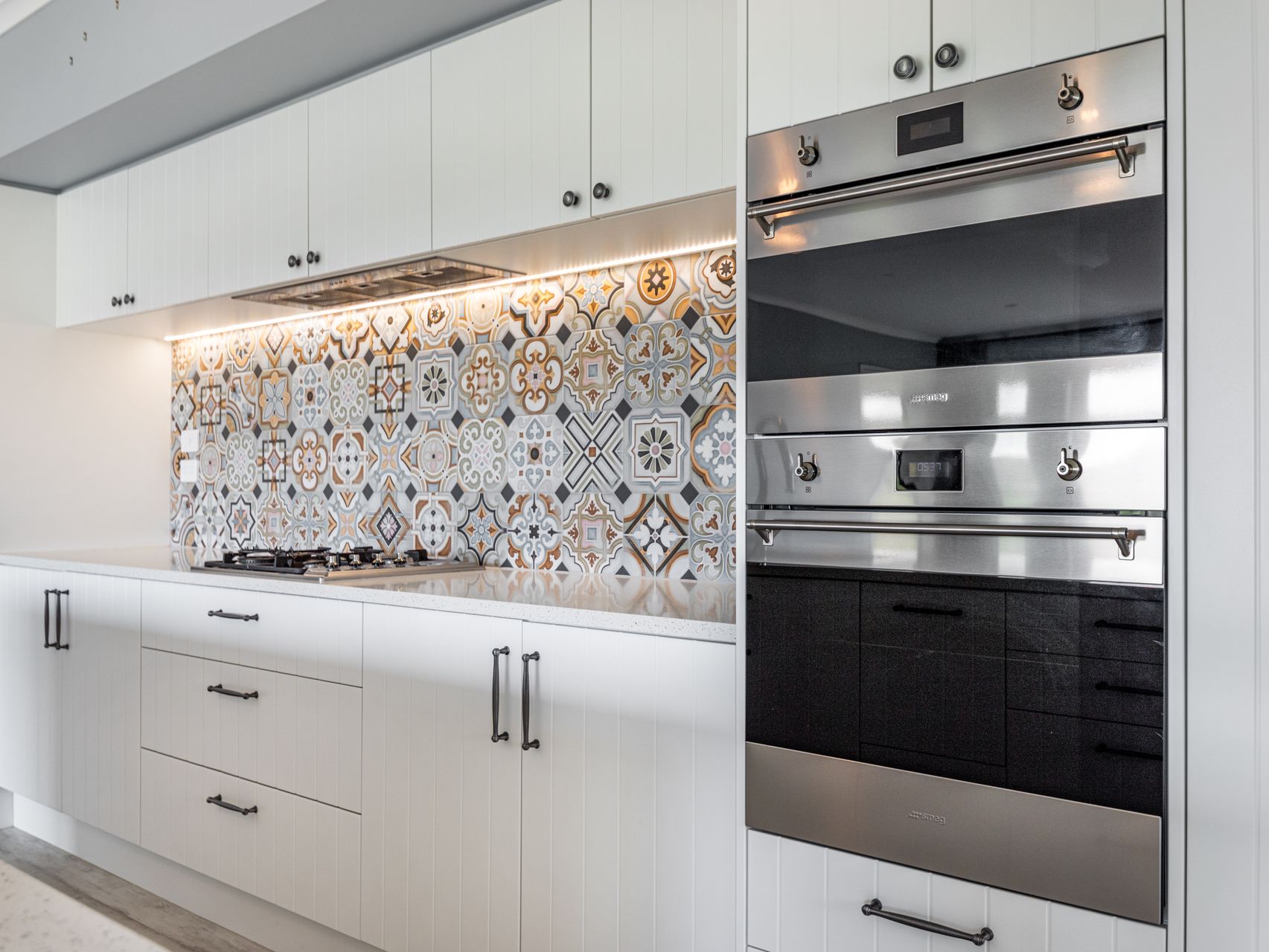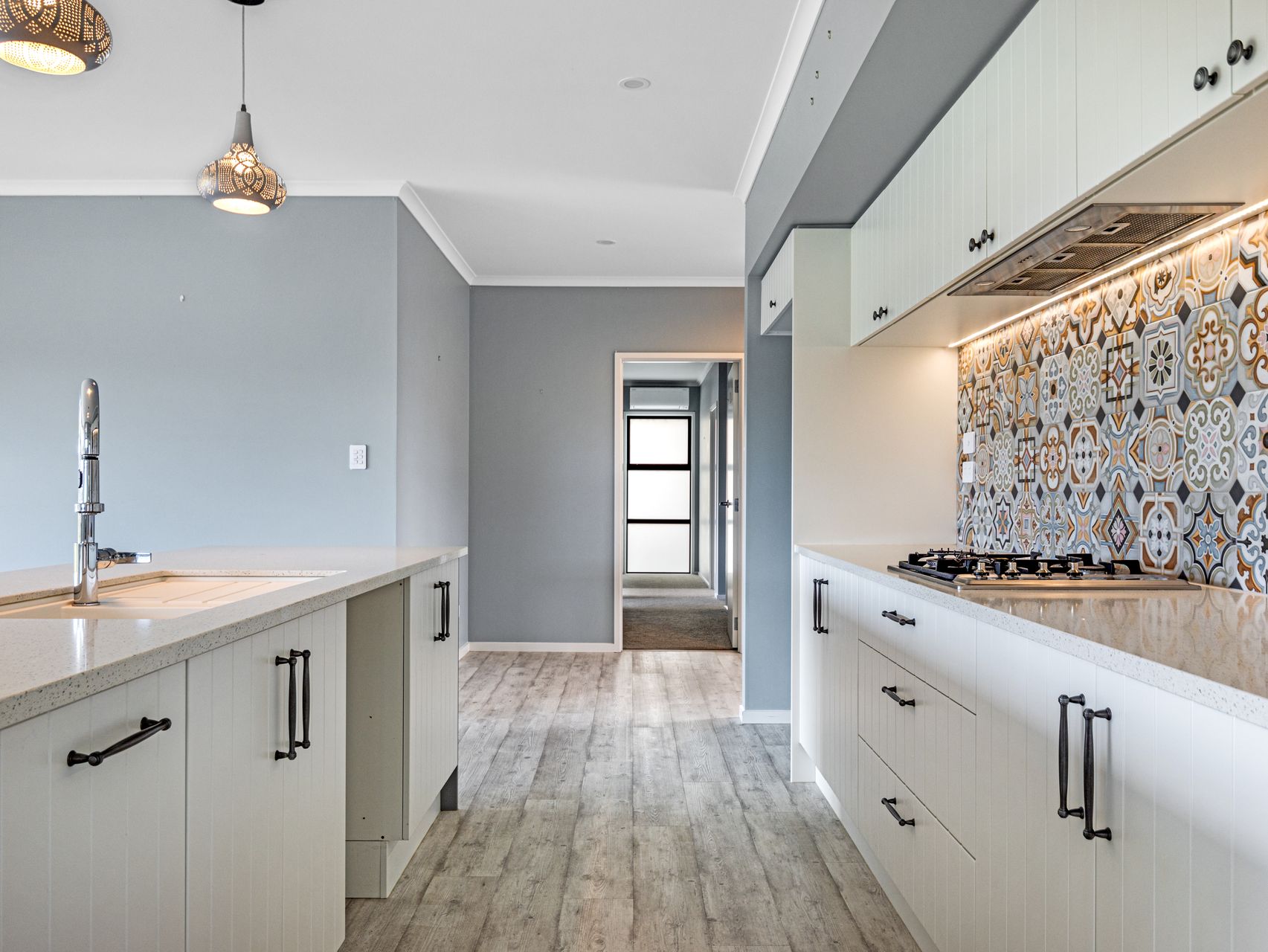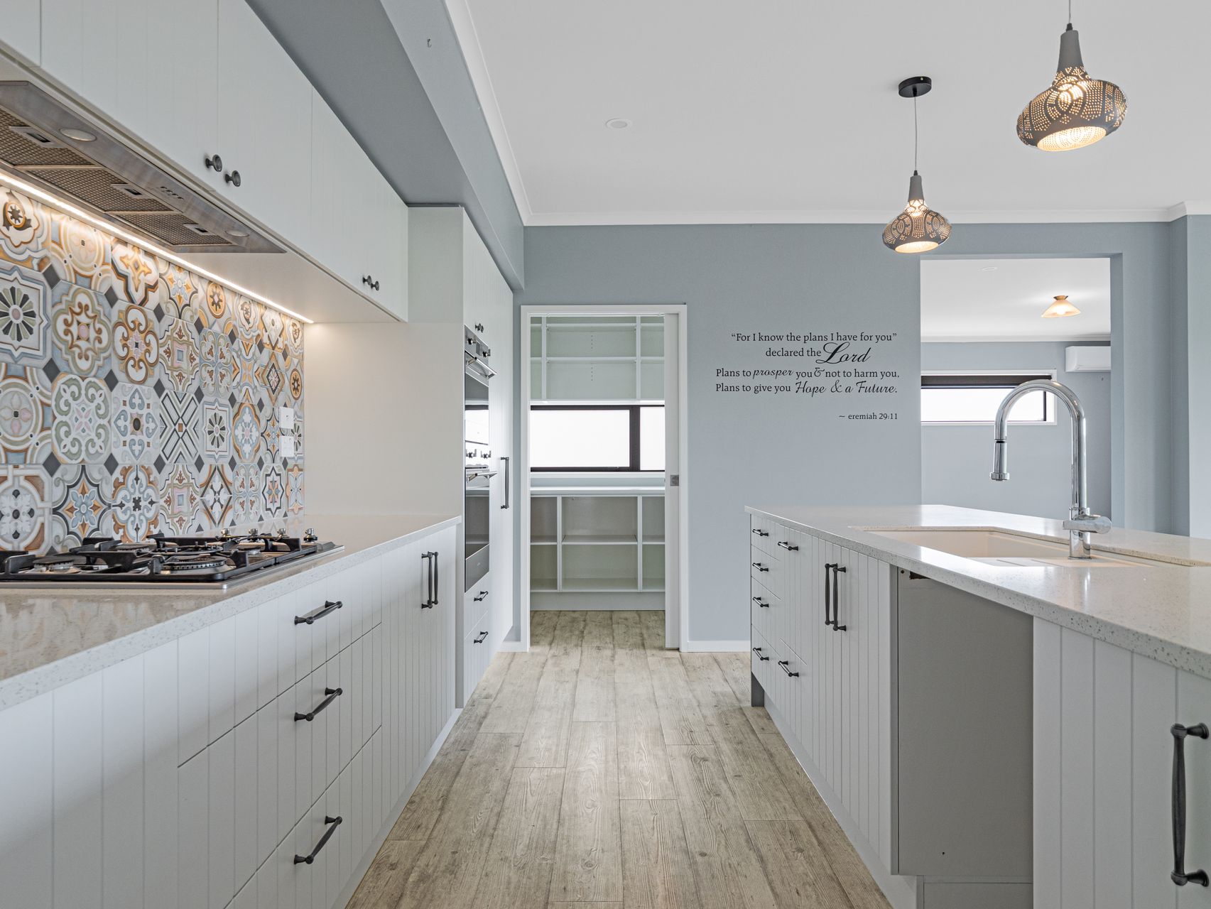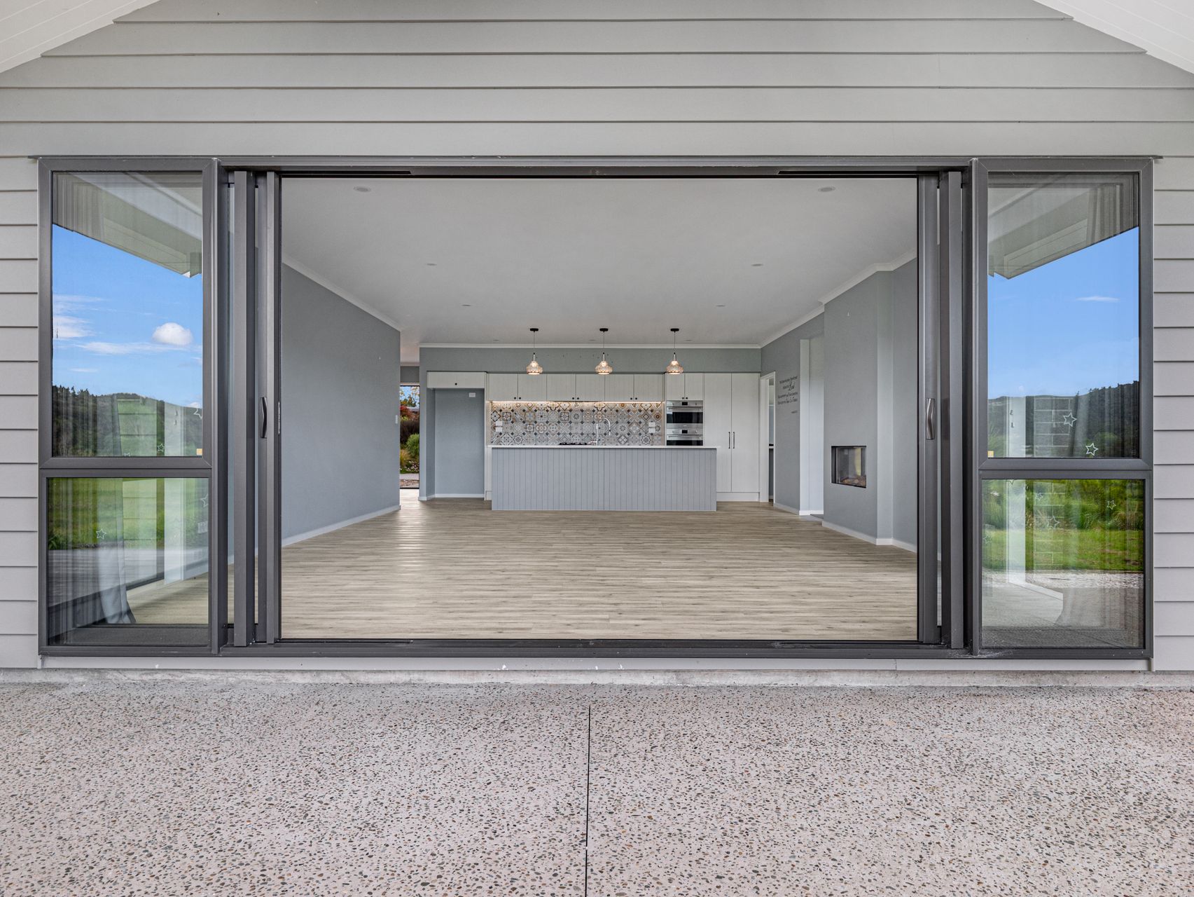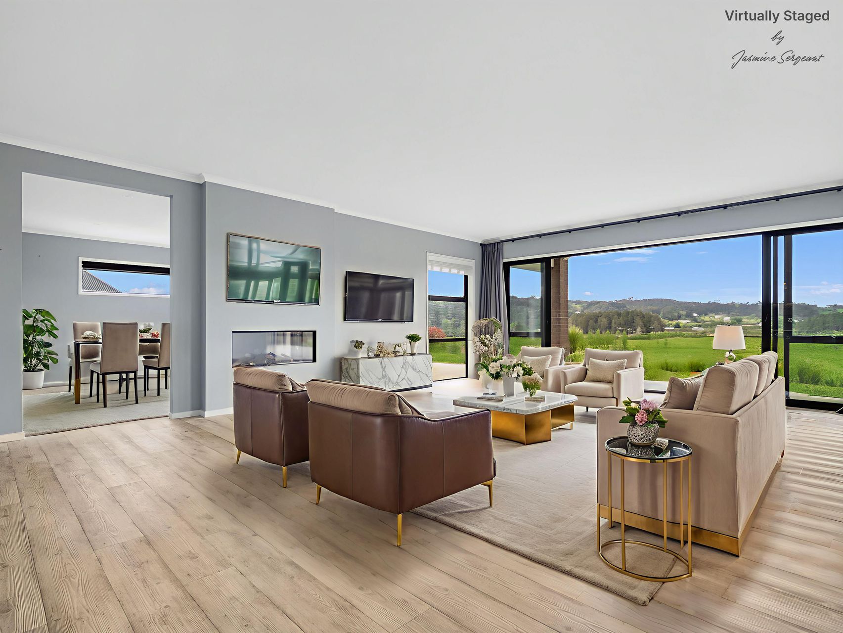 The hallway opens into an expansive open-plan living, dining & kitchen zone with sliding doors to the greenery beyond. The kitchen, with its dual ovens, gas hob & walk-in pantry, is designed for those who love to cook and entertain. A second lounge with a double-sided fireplace offers a cosy winter retreat, while two heat pumps ensure effortless comfort through every season.