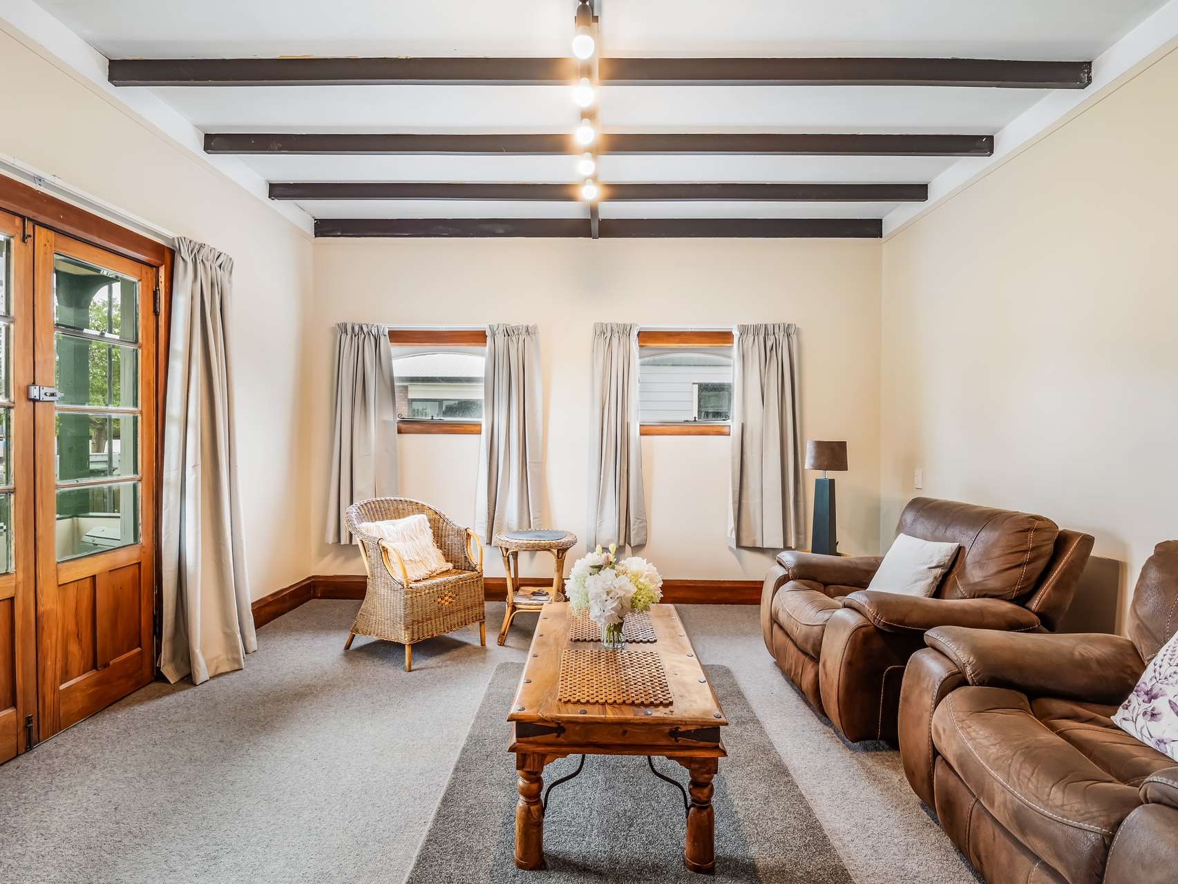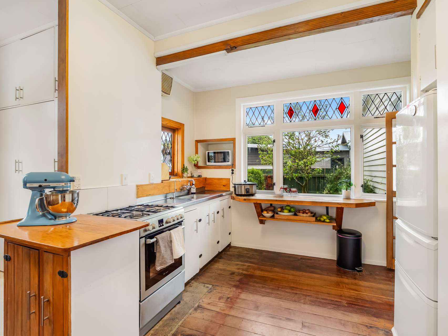 Downstairs, sunlight spills across polished floors, warming the kitchen and dining zone that looks straight onto the leafy backyard. The living area carries that same sense of comfort - exposed beams, French doors, and generous proportions that make gatherings feel easy. Every room has its own charm, from the bay-windowed bedroom to the library-like hallway and practical laundry and pantry spaces that keep life organised.