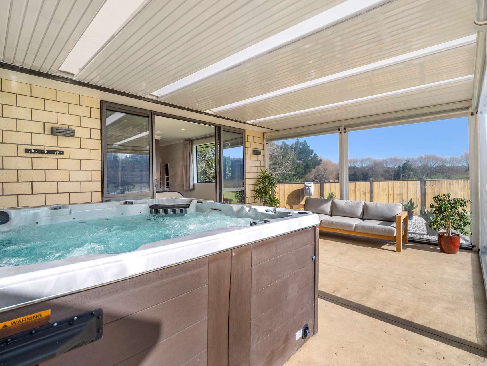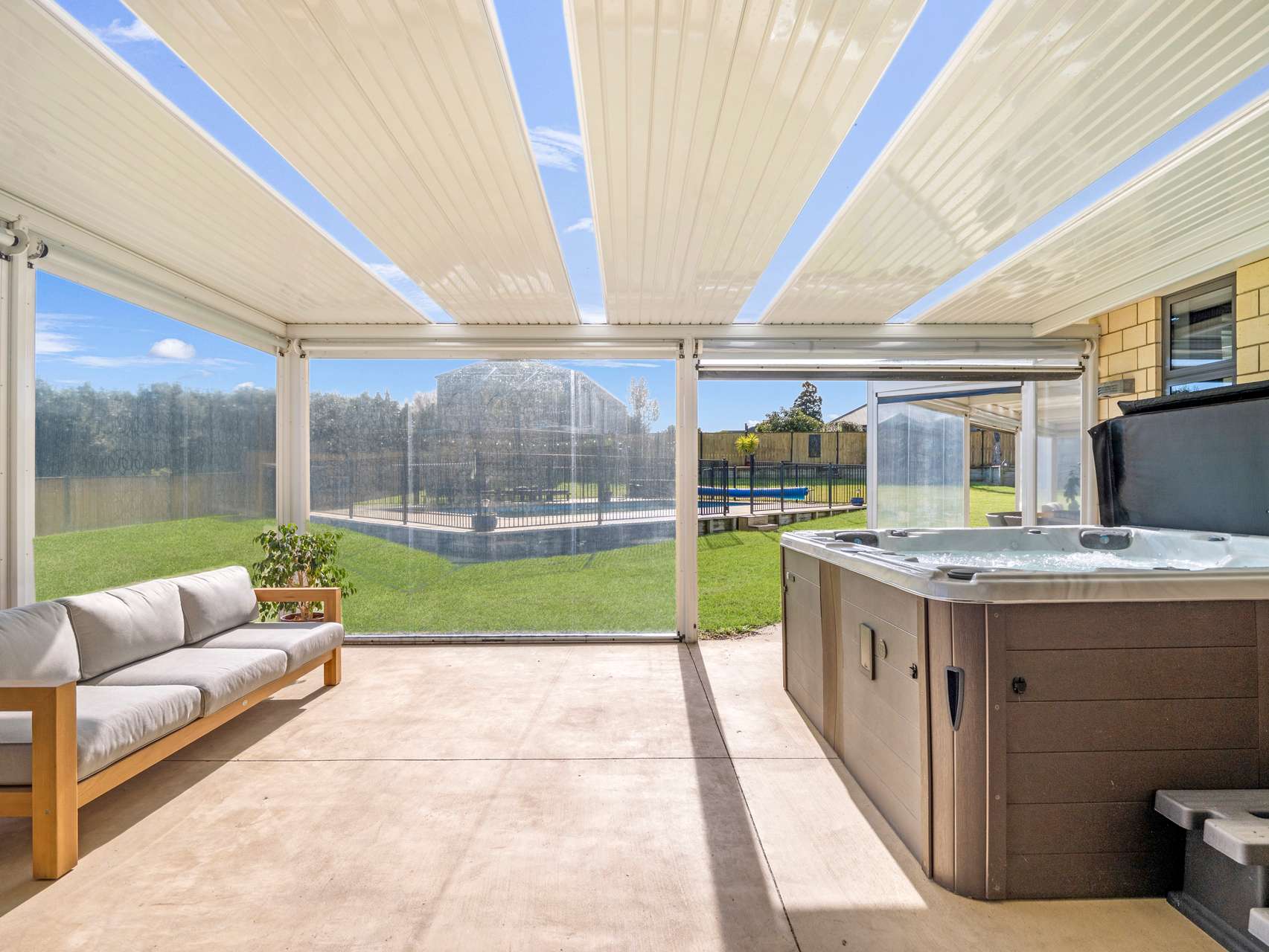 The separate living space with its central fireplace is a relaxing space to hang out with family or enjoy a drink with friends. For larger occasions these spaces open out to a big covered outdoor living area with plenty of room for a dining table, seating area and BBQ. This all-weather space has roller blind sides that you can put up when the sun is out and a path from here leads to the pool area for summer fun.