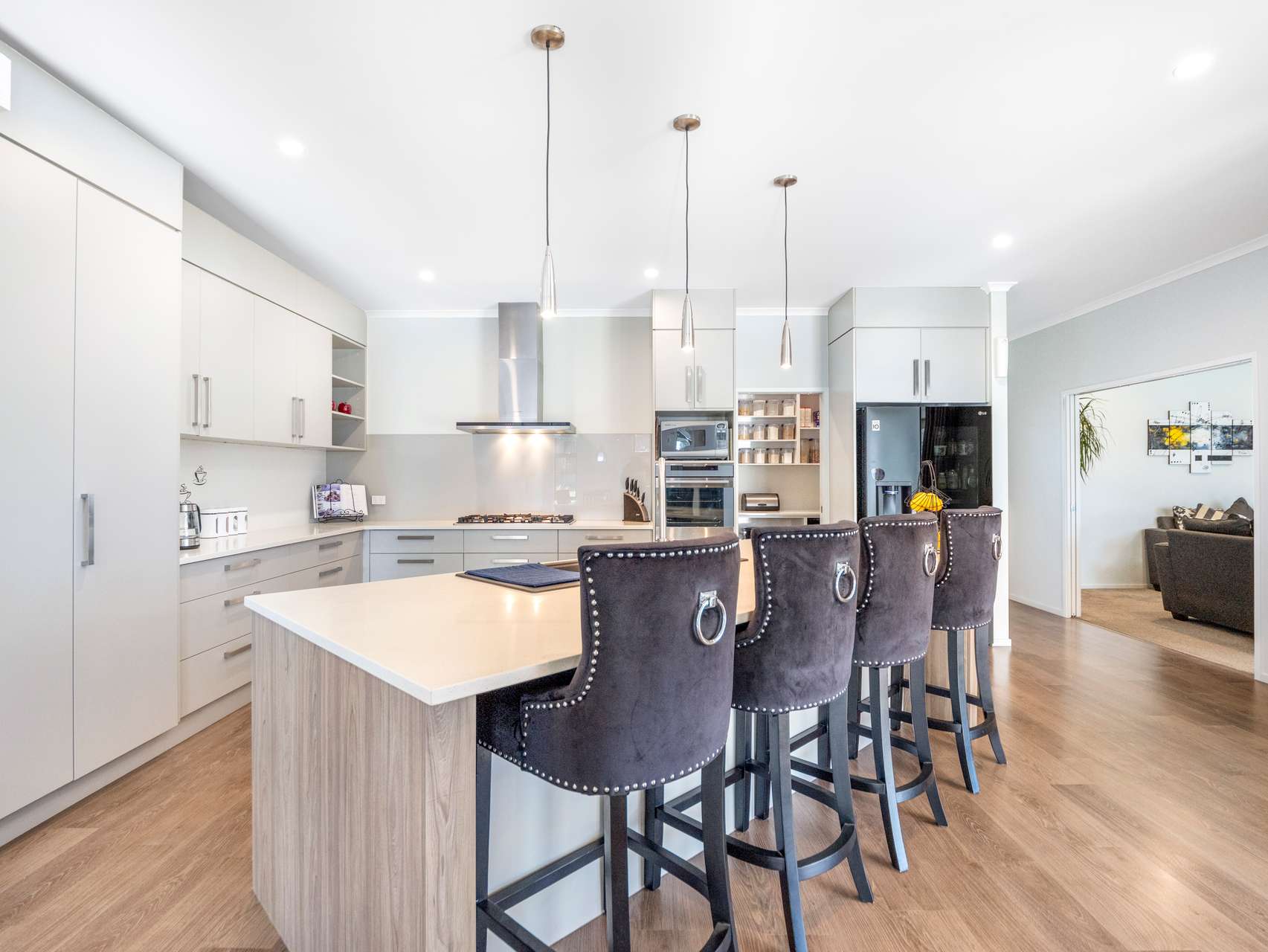 Central to it all is a spectacular open kitchen, dining zone designed for serious hosting. The gourmet kitchen includes two full dishwashers, two ovens, gas cooktop, lots of bench space and storage, a large island with seating, exquisite cabinetry, and a substantial pantry.