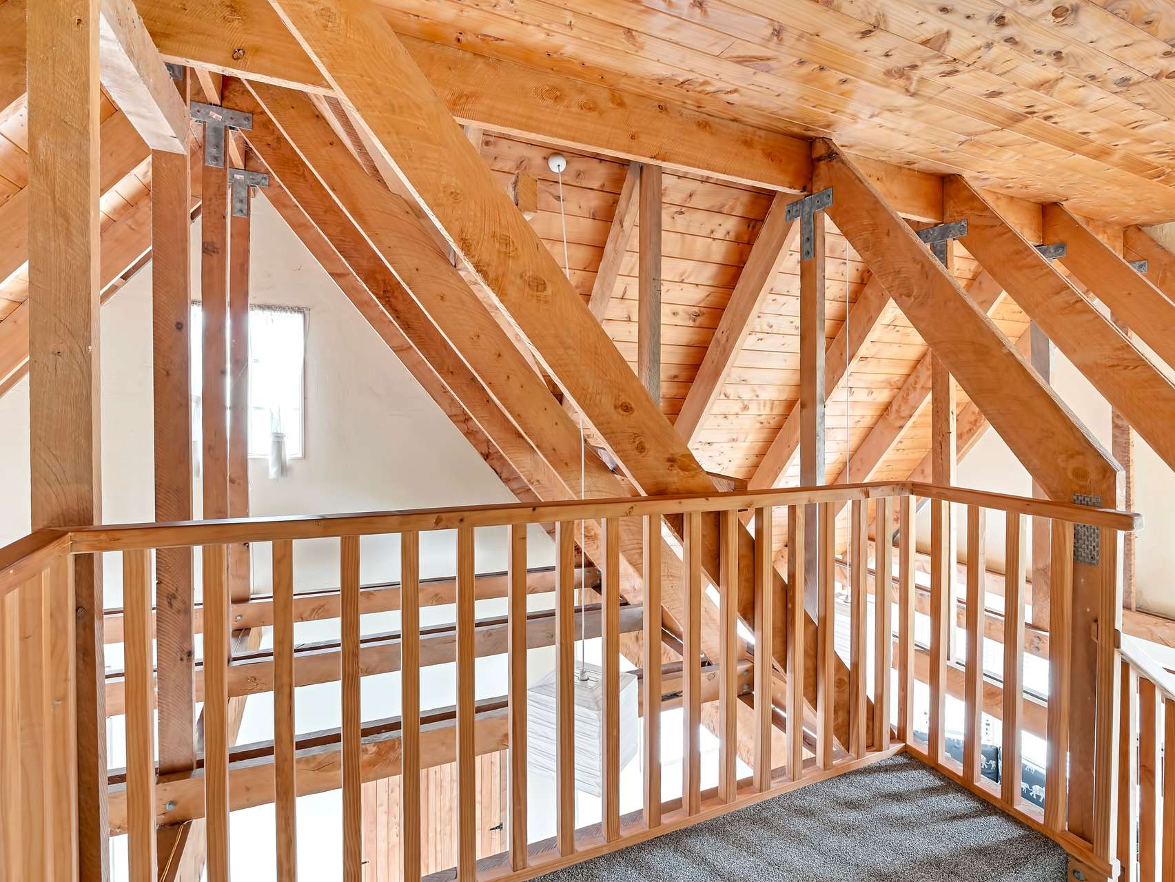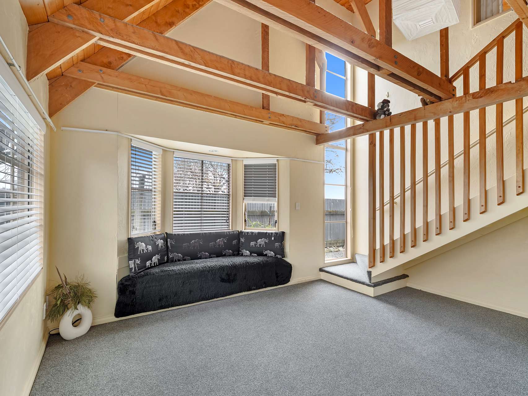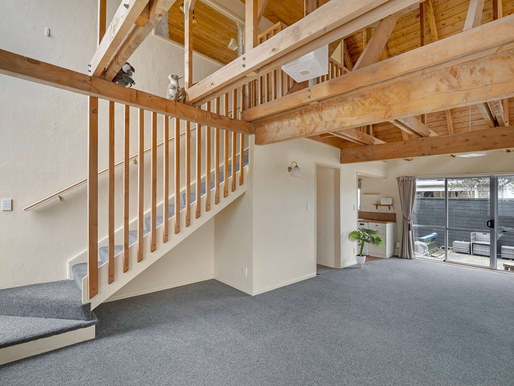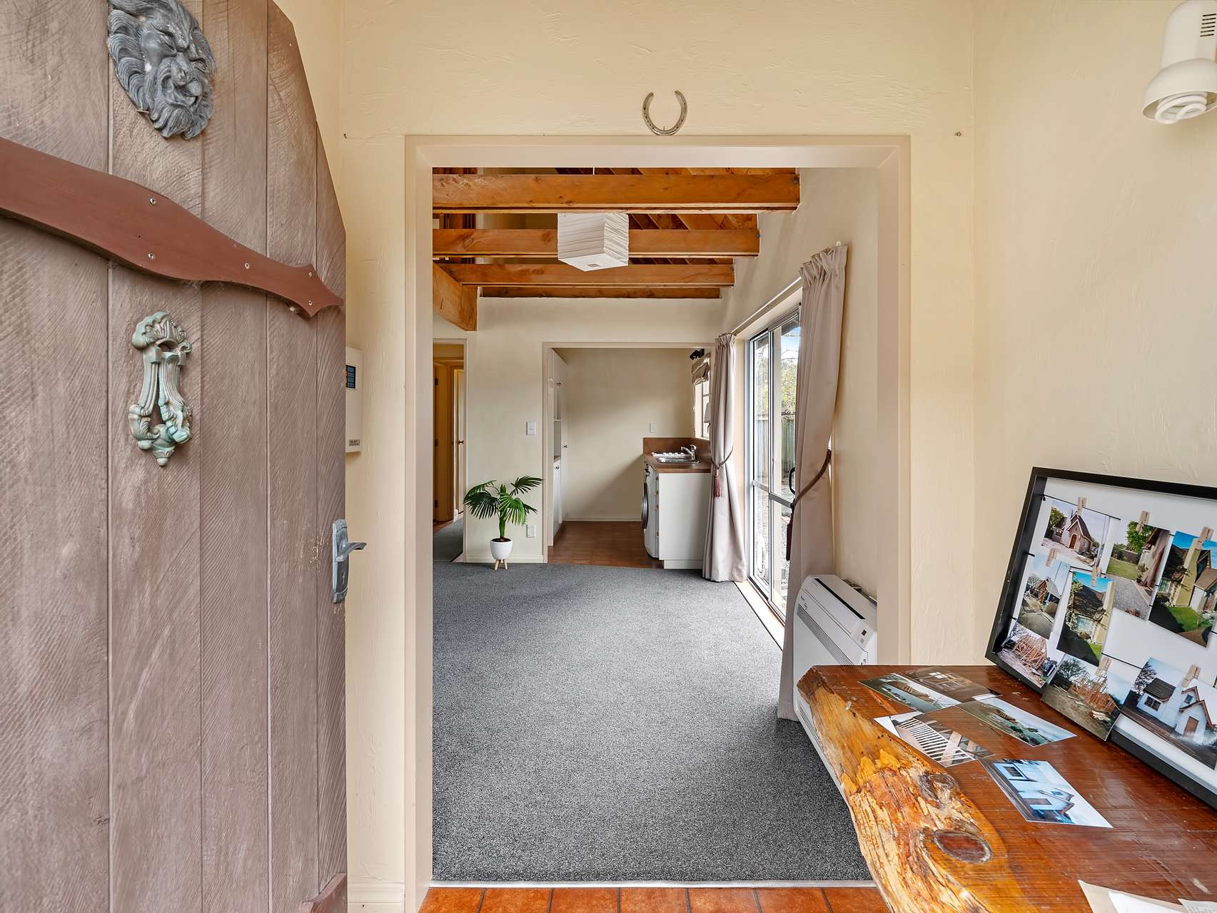 Step through the beautifully crafted door and you’ll find a living space that feels generous and inviting. Exposed beams add warmth and dimension, while large windows offer a view out to the easy care gardens. The kitchen is functional and the heat pump ensures all year round comfort.