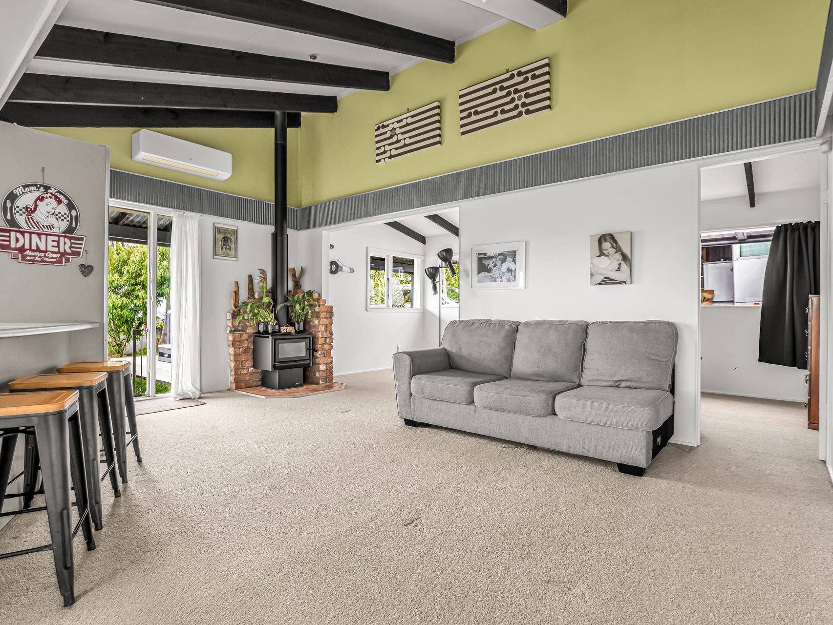At the heart of the home, the open-plan living and dining area is warm and inviting, enhanced by exposed ceiling beams and a wood burner that creates a cosy atmosphere through the cooler months. Large windows invite natural light and connect seamlessly to the outdoor entertaining areas.