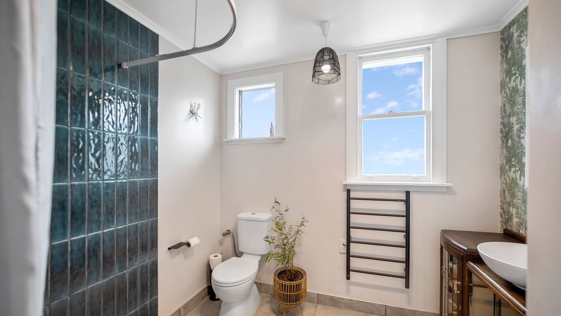 The bathroom has also been beautifully updated with an antique style vanity, clever face height storage, and absolutely incredible turquoise tiling in the shower area.