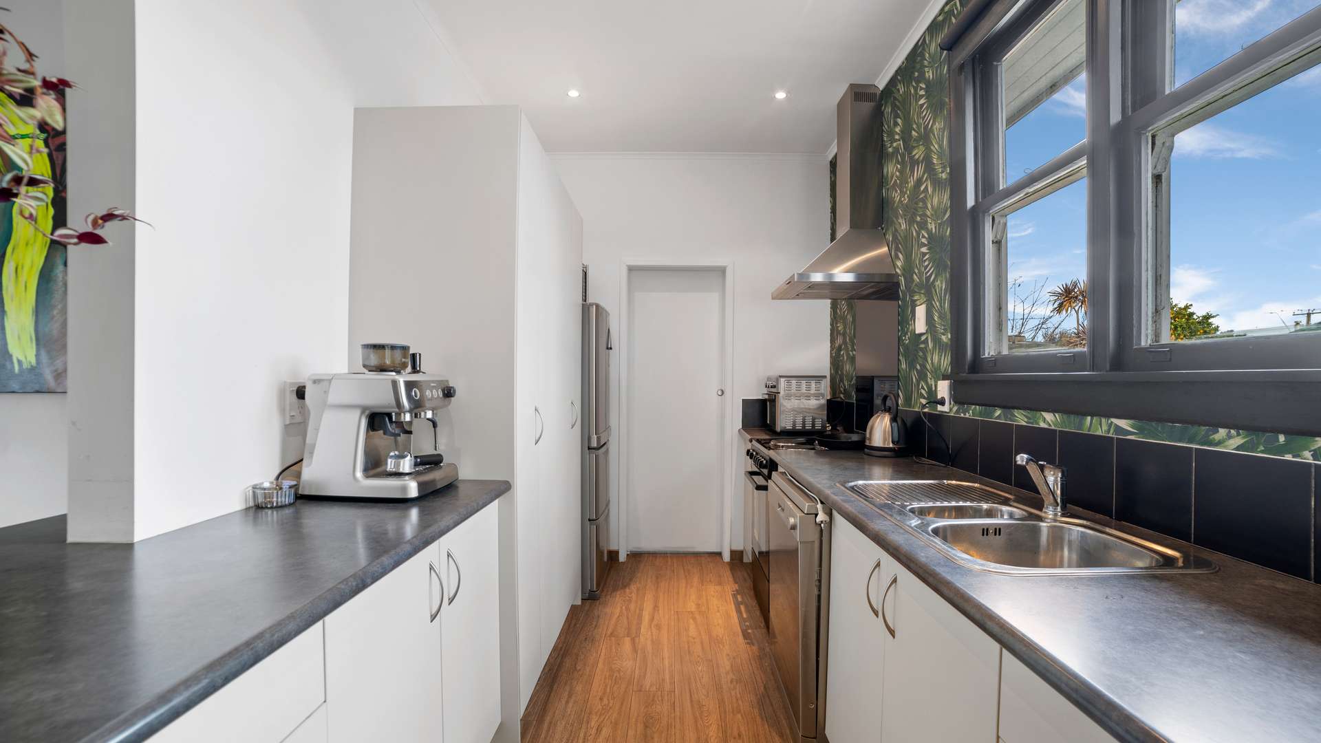 Well laid out with lots of bench space, the galley style kitchen is just right. It has beautiful leafy green wallpaper feature wall, lots of natural light and plenty of cabinetry for easy storage.