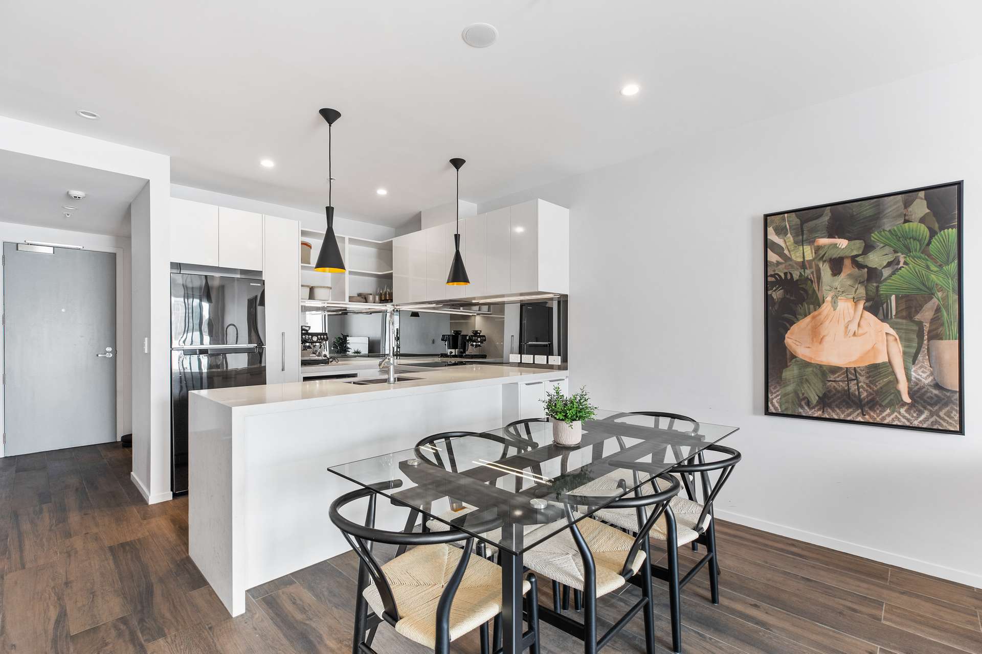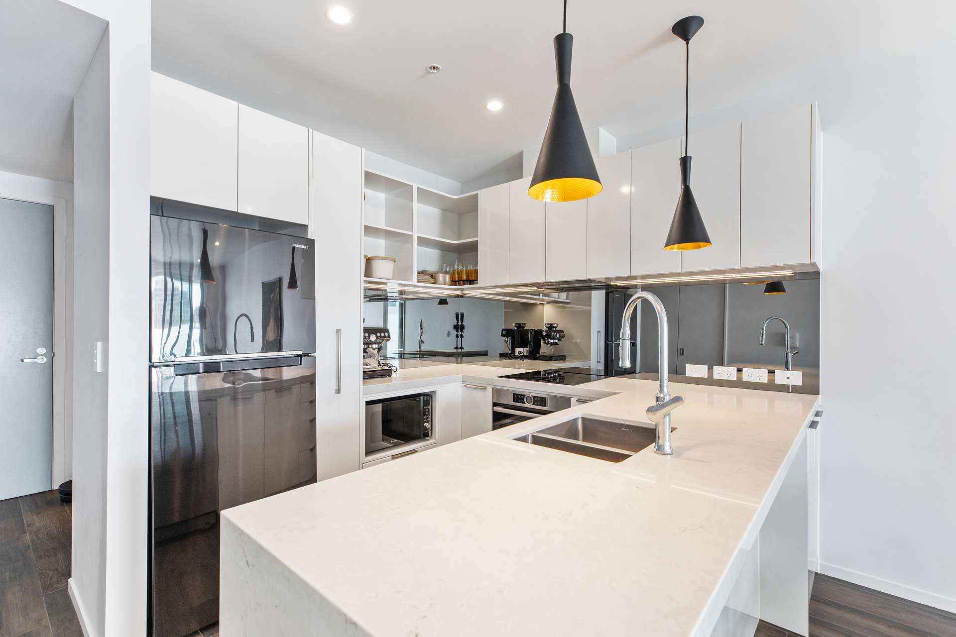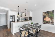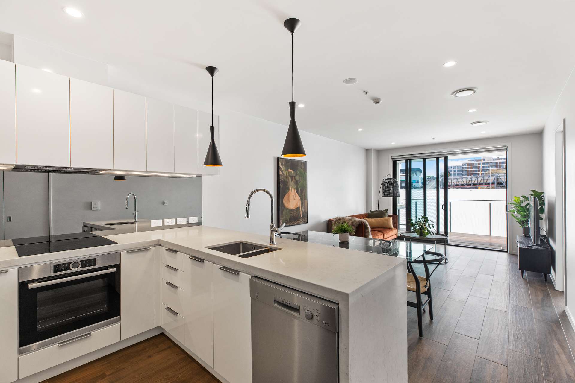 Sleek and elegant, the kitchen is well thought out as well as stylish. It has glossy white cabinetry, a gorgeous white benchtop, eye-catching black pendants and space for all of the essentials. It looks out across the dining area through to the light filled lounge and outside to the spacious deck.