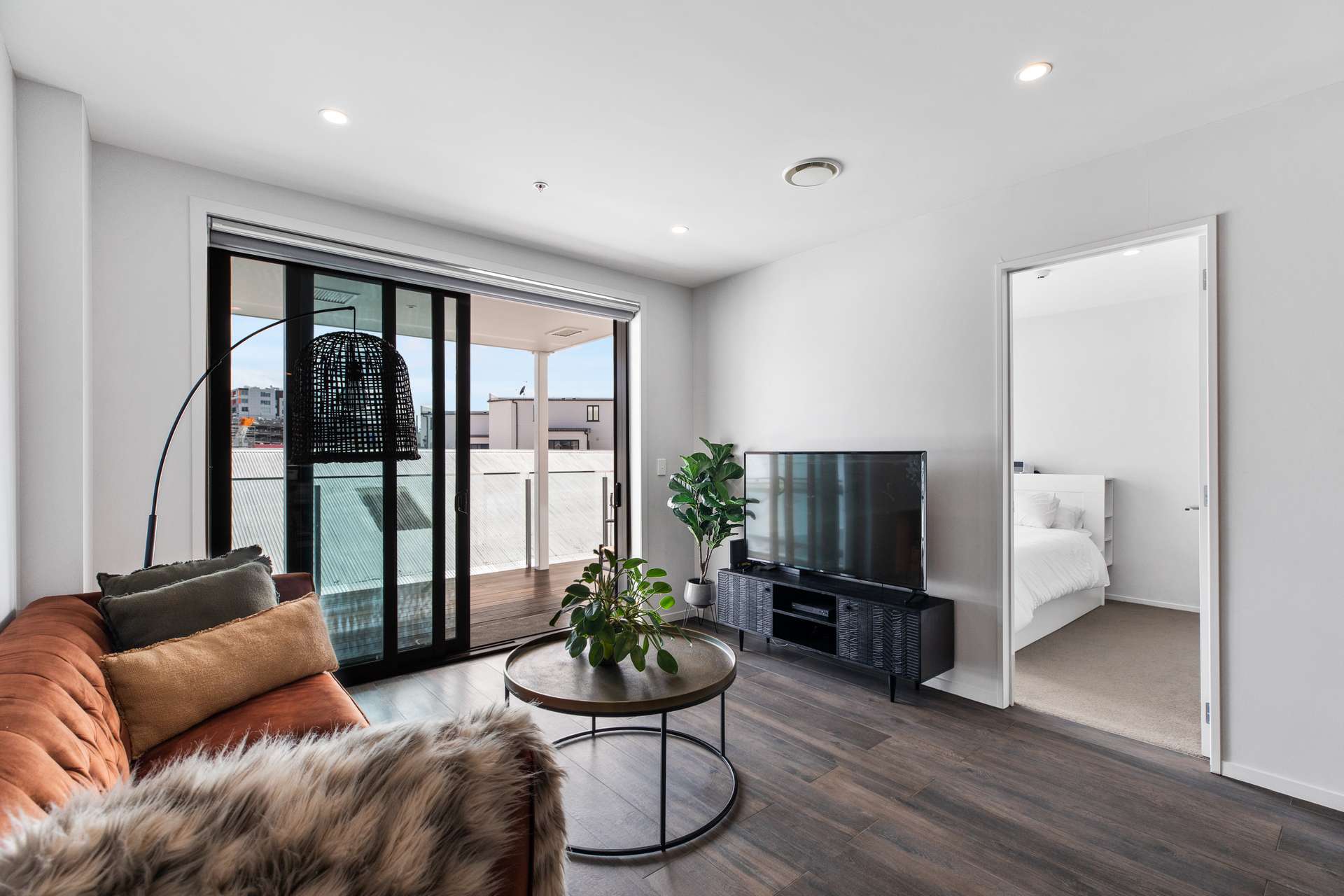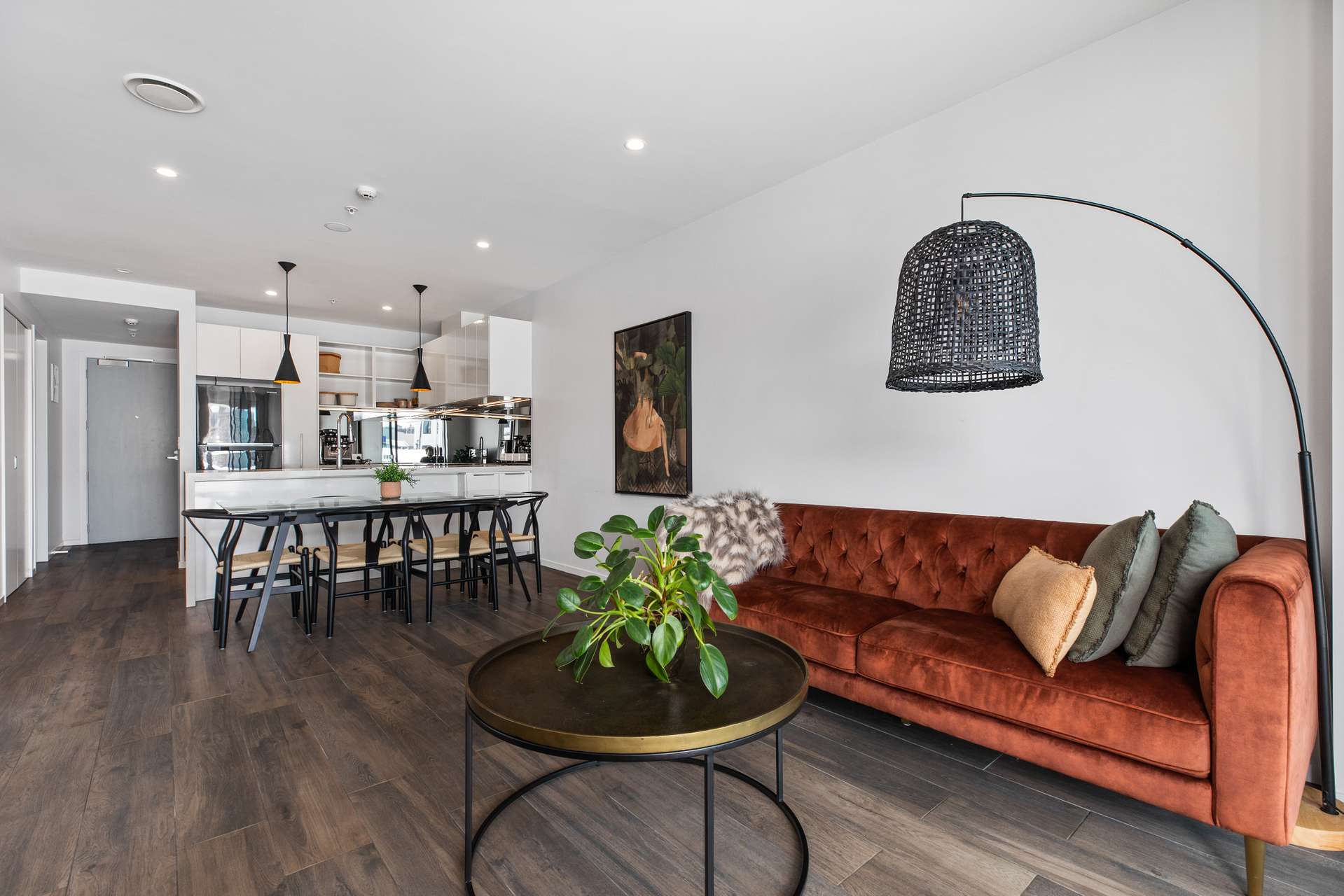 The living area is chic and contemporary, it has beautiful dark flooring combined with light walls, and modern downlights. From here you can pop through to the particularly spacious master bedroom which has a large walk in wardrobe and ensuite with gorgeous tiling that nicely matches the main bathroom. There are two beautiful bedrooms in total, giving this home wide appeal.
